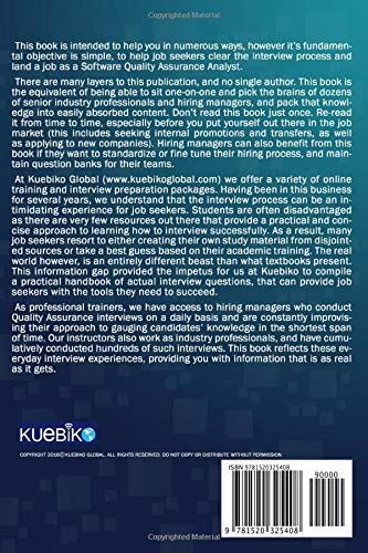 This book is intended to help you in numerous ways, however the fundamental objective is simple- to help job seekers clear the interview process and land a job as a Software Quality Analyst. There are many layers to this publication, and no single author. This book is the equivalent of being able to sit one-on-one and pick the brains of dozens of senior industry professionals and hiring managers, and pack that knowledge into easily absorbed content. Don’t read this book only once. Re-read it from time to time, especially before you put yourself out there in the job market (this includes seeking internal promotions and transfers, as well as applying to new companies). Even hiring managers can benefit from this book if they want to standardize or fine tune their hiring process, and maintain question banks for their teams.