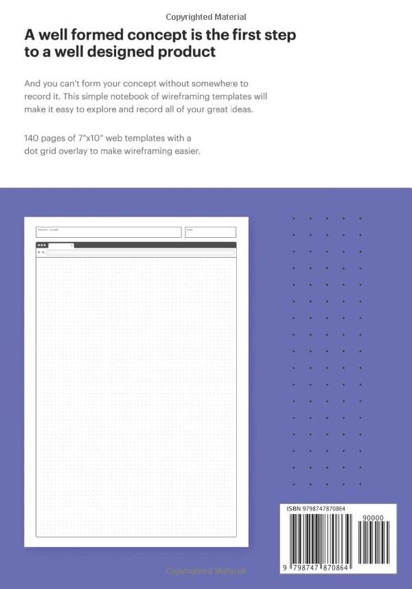A well formed concept is the first step to a well designed product. This simple ux sketchbook of wireframing templates will make it easy to explore and record all of your great ideas. It cointains: * 140 pages to fill up with your ideas and inspiration * 7″ x 10″ size that gives you plenty of room to work * Web browser templates so that you don’t need to sketch it out each time * Dot grid overlay to keep all of your alignment in check * Notebook space to write down other relevant thoughts and information * A great gift for ux designers or web developers