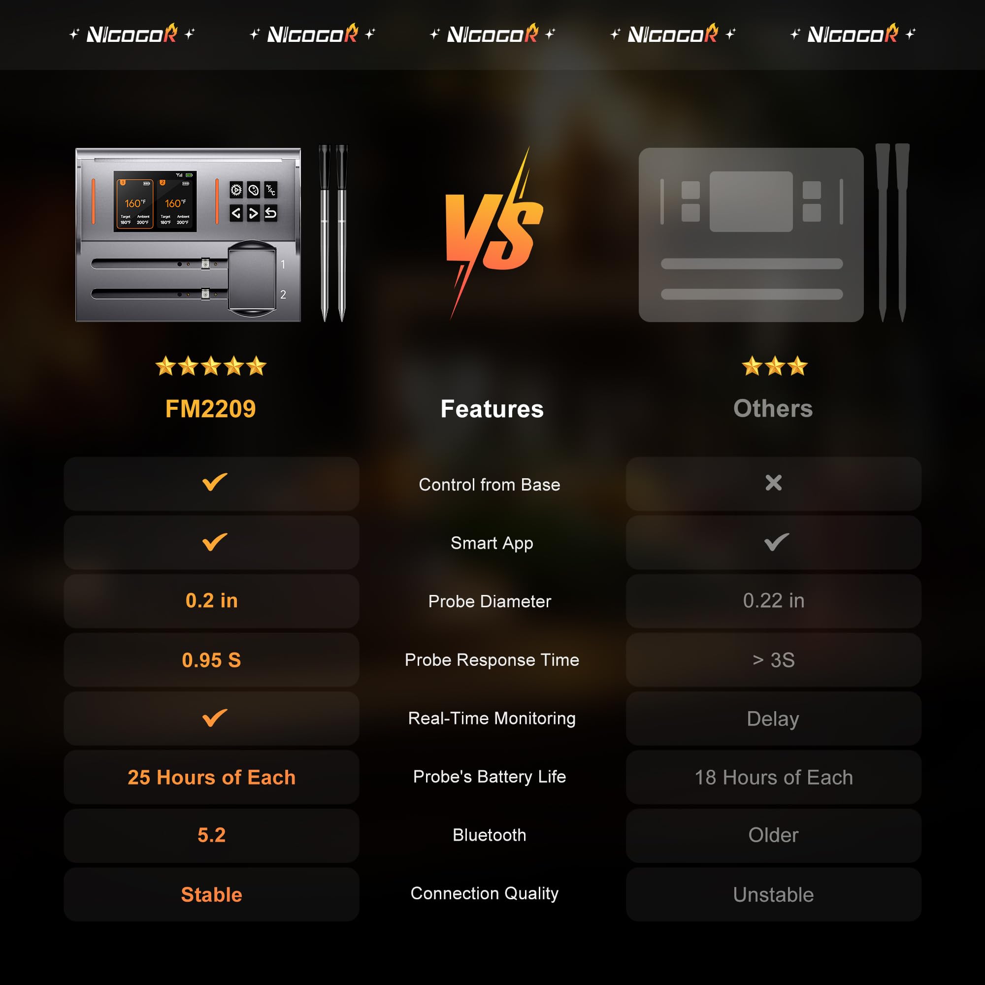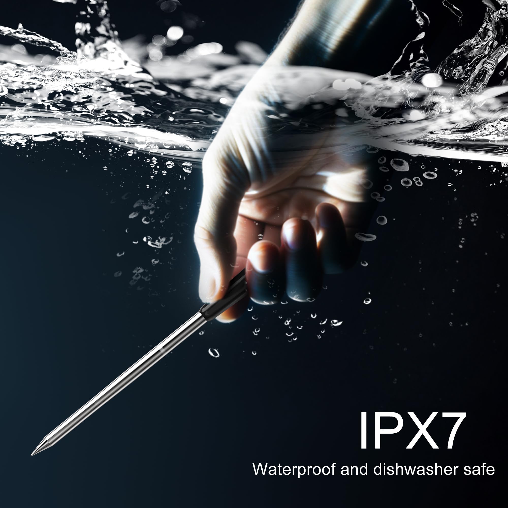 - Dual-Temperature Monitoring with Ceramic Probe: 2 ultra-thin wireless meat probe sensors track internal meat temp (212degF) and ambient Grill/Smoker temp (572degF) simultaneously. Heat-resistant ceramic handle ensures faster heat transfer & meat integrity. IPX7 waterproof probes and dishwasher safe, effortless cleaning.