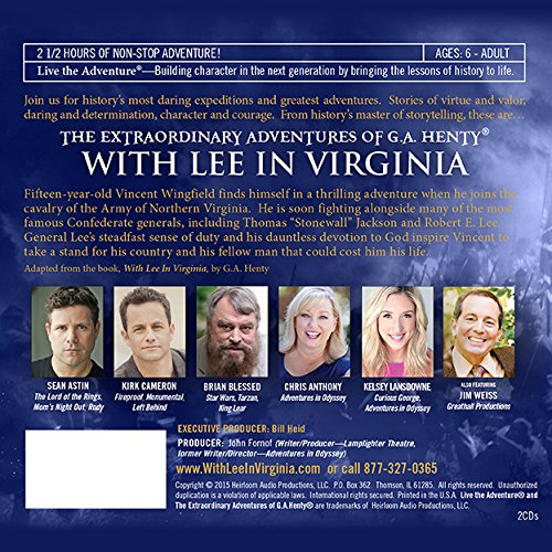 The third audio adventure released by Heirloom Audio. Fifteen-year old Vincent Wingfield finds himself in a thrilling adventure when he joins the cavalry of the Army of Northern Virginia. He is soon fighting alongside many of the most famous Confederate generals, including Thomas “Stonewall” Jackson and Robert E. Lee. General Lee’s steadfast sense of duty and his dauntless devotion to God inspire Vincent to take a stand for his country and his fellow man that could save his life. It’s time to Live The Adventure!. Adapted from the book, With Lee In Virginia, by G.A. Henty
