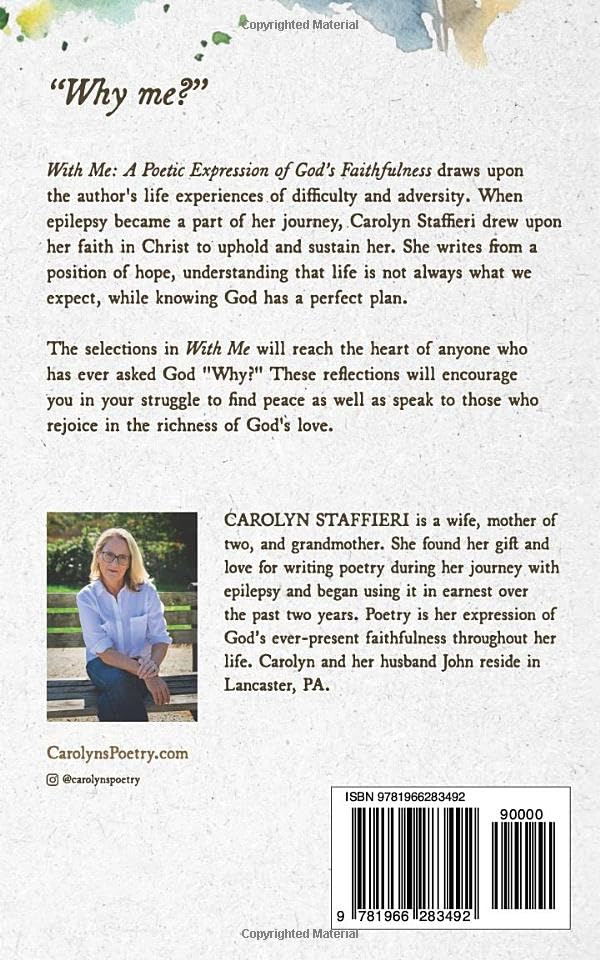 With Me: A Poetic Expression of God’s Faithfulness draws upon the author’s life experiences of difficulty and adversity. When epilepsy became a part of her journey, Carolyn Staffieri drew upon her faith in Christ to uphold and sustain her. She writes from a position of hope, understanding that life is not always what we expect, while knowing God has a perfect plan. The selections in With Me will reach the heart of anyone who has ever asked God “Why?” These reflections will encourage you in your struggle to find peace as well as speak to those who rejoice in the richness of God’s love.