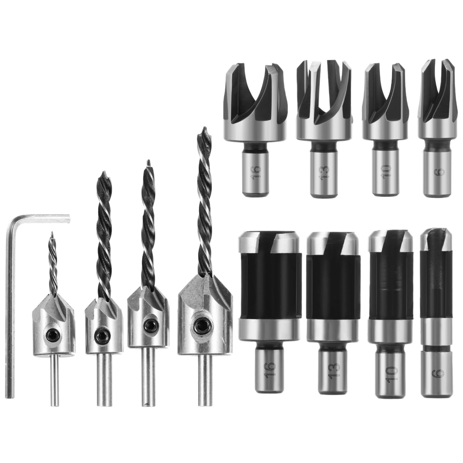 • [(Practical Combination Set)] This set includes 4 straight wood plug cutters, 4 four-tooth chamfered tapered wood plug cutters, 4 countersink drill bits, and 1 wrench, nicely catering to all your daily woodworking needs. plug cutters sizes: 1/4″, 3/8″, 1/2″, and 5/8″. Drill bits sizes: 0.12, 0.16, 0.2, and 0.24.