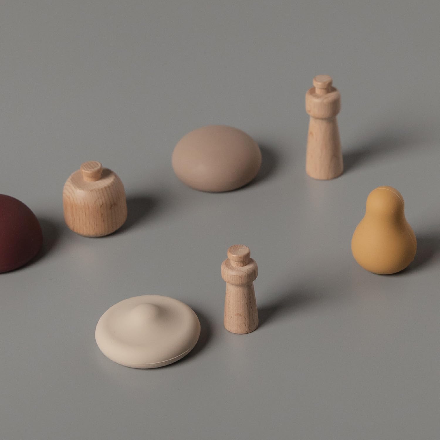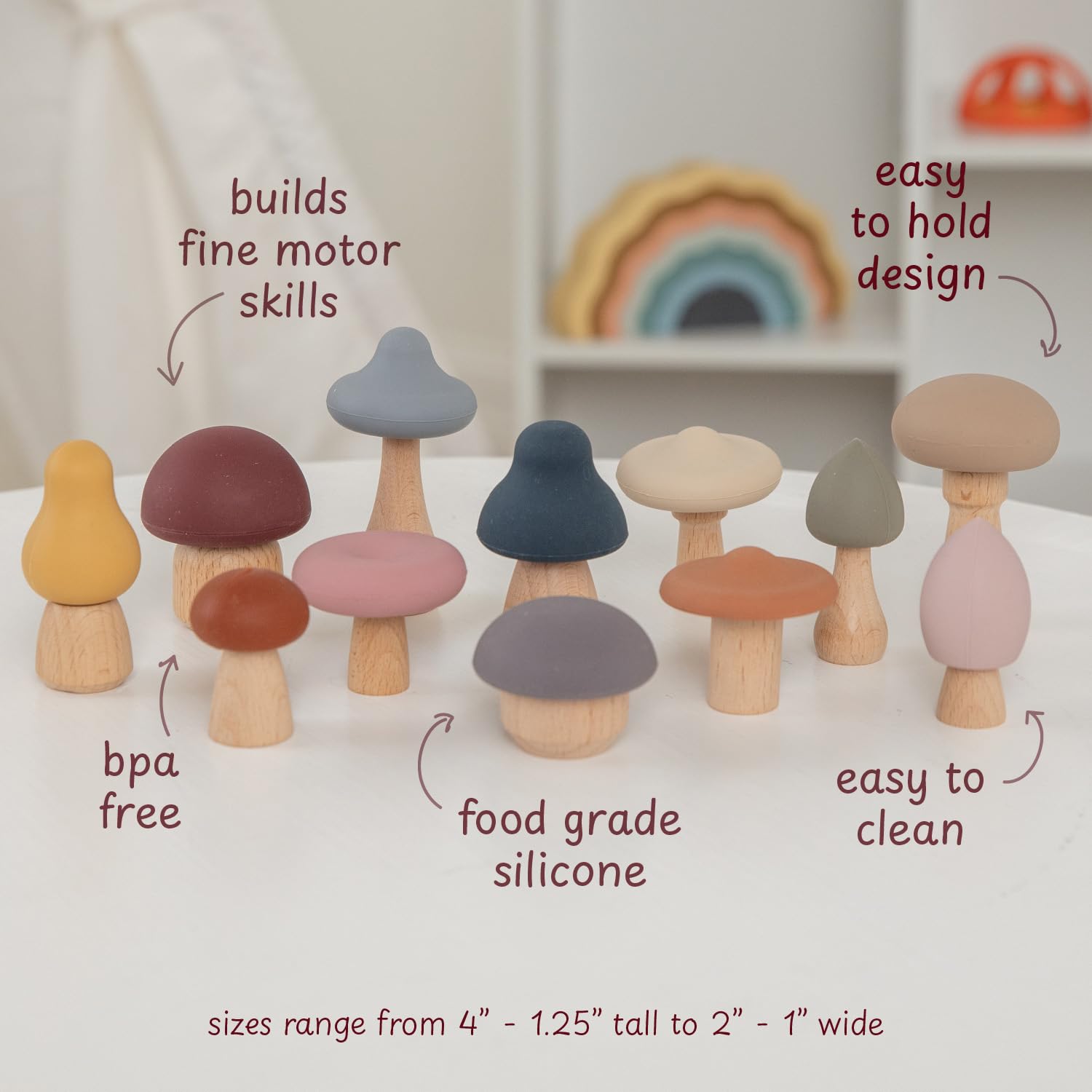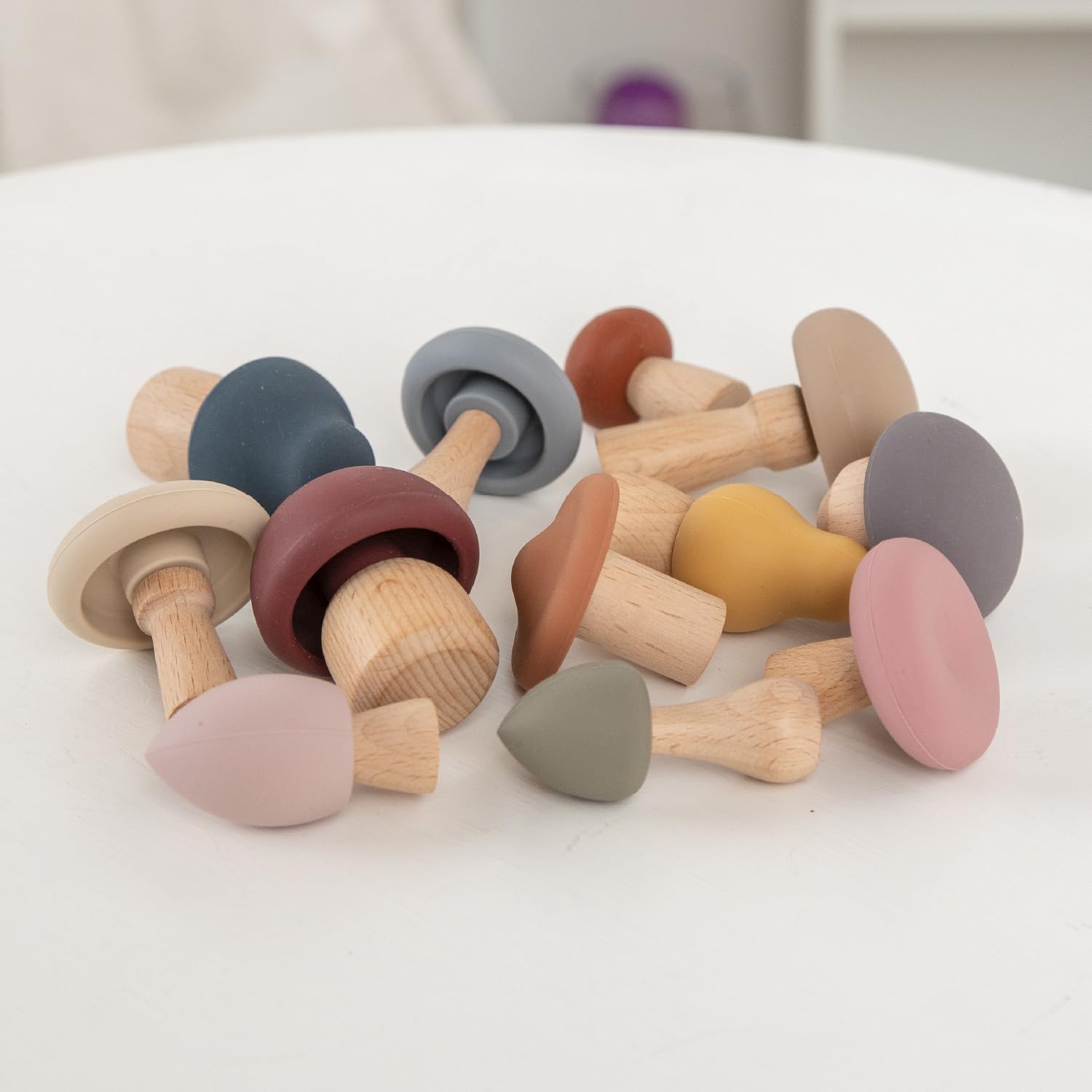 - DURABLE CONSTRUCTION: Sturdy wooden stems have shapes designed for little hands to grip and ensure long-lasting play value. The silicone mushroom tops are made from BPA free, food grade silicone and will last a lifetime. Wood bases can be wiped clean with a damp cloth and mild soap. Mushroom tops can be submerged and sanitized.