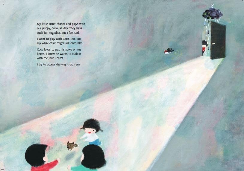 Based on an actual story, a girl with cerebral palsy feels trapped in her body and unable to communicate. It causes her to grunt in anger, scaring off children and making it impossible to make friends. When her art teacher straps a paintbrush to her head, the children nickname her “Woodpecker Girl.” But the girl begins to paint her thoughts and feelings and her talent bursts through. Illustrator Huang mimicked the girl’s style for the book and the girl’s real paintings are displayed in the backmatter.