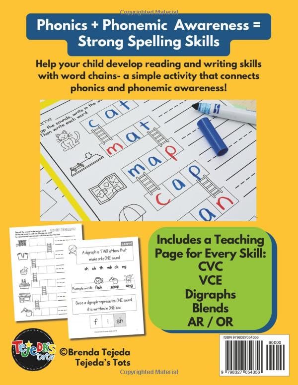 Enhance your child’s reading and spelling skills with these Word Chain phonics activities! Designed for kindergarten and first-grade students, this interactive workbook combines essential phonics and phonemic awareness skills to build strong literacy foundations. Through engaging word ladder exercises, your child will develop crucial skills in blending, segmenting, and decoding words. This workbook includes: Phonics Activities: Strengthen understanding of letter-sound relationships. Spelling Practice: Enhance spelling skills with targeted word chains. Reading Fluency: Improve reading speed and accuracy with word ladders. Handwriting: Improve fine motor skills and handwriting through structured activities. Organized by skills: Includes CVC, Digraphs, Blends, VCE, and AR/OR. Each skill section includes a dedicated teaching page for clear guidance! Perfect for use at home or in the classroom, this workbook supports parents and educators in fostering early reading and writing success. With clear instructions and fun, educational activities, it’s an invaluable resource for any primary grade student. Early Literacy Development: Help your child become a confident reader and speller!