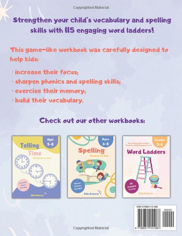 Strengthen your child’s vocabulary and spelling skills with 115 engaging word ladders! Help boost your child’s educational journey by enhancing their vocabulary, reading, and spelling skills with 115 engaging word ladder puzzles. This game-like workbook was carefully designed to help kids: increase their focus; sharpen phonics and spelling skills; exercise their memory; build their vocabulary. The introduction of this workbook includes a clear explanation on how to solve word ladders (with an example puzzle). After that, your child can experience various captivating puzzles that offer a perfect blend of learning and fun. If you are looking to help your child solve fun, engaging word ladders while strengthening their vocabulary and spelling skills, then look no further. Scroll up and order your copy today!