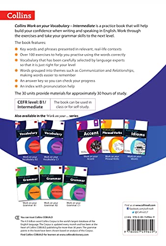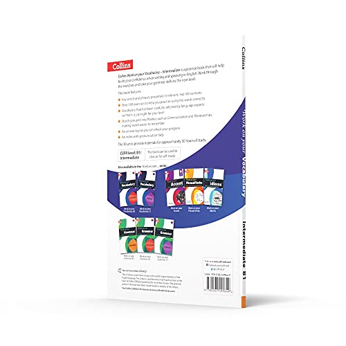 Hundreds of words to learn and remember Collins Work on your Vocabulary – Intermediate (B1) is a new practice book that covers the key vocabulary needed by learners of English at Intermediate level (CEF level B1). This book is an essential resource for learners who want to improve their English vocabulary. Each of the 30 units presents vocabulary relating to a particular topic using clear language and examples. This is followed by practice exercises to ensure the learner will remember and be able to use what they have learnt with confidence in their written and spoken English. The vocabulary covered in Collins Work on your Vocabulary – Intermediate (B1) has been carefully selected based on Collins Corpus research and the experience of our language experts. As a result, this book provides plenty of useful practice with authentic, up-to-date examples of language usage in context. A carefully structured layout and simple illustrations make sure the language is always clear and the book is easy to navigate. Collins Work on your Vocabulary – Intermediate (B1) is ideal for self-study or for use in the classroom, and is an essential resource for students and teachers. Focuses on the vocabulary required at Intermediate level (CEF level B1) Thirty units with clear presentation material followed by practice exercises Authentic examples of real English, taken from the Collins Corpus Includes line drawings which illustrate key concepts Clear structure and presentation of language Plenty of room to write in Full answer key included Ideal for self-study or for use in the classroom