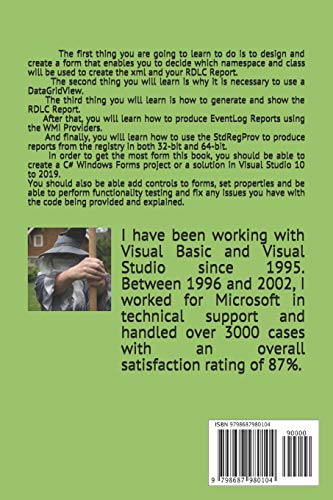 This book has all the code in it needed to create RDLC Reports dynamically. There is a lot of information on how this code came about and with some cooperation from the reader, can be added to a project so that in less than a day, you will be able to create table style RDLC Reports that require none of the usual manual adjustments to the field widths – which I personally, found taking more time to do than creating the report itself.Included in this book is code to create RDLC Reports from event logs and from the registry.Imagine being able to perusal through the registry, find a subkey with valuable Names. types and data, right click on the DataGridView and press the button and one second later, your report is created and being displayed right in front of you with perfect widths between fields.That’s kind of addicting.