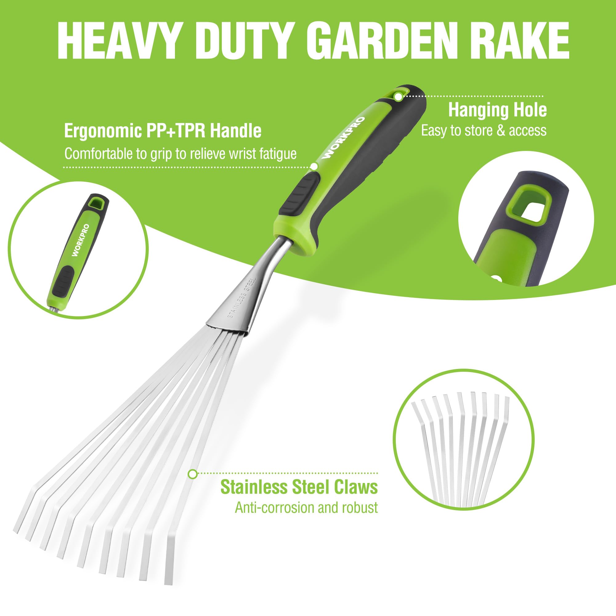 WORKPRO 16" Hand Rake, Heavy Duty Stainless Steel Garden Rake with Soft Handle, Small Garden Hand Tool for Gardening, Cultivating, Loosening Soil & Spreading Mulch, Flower Beds