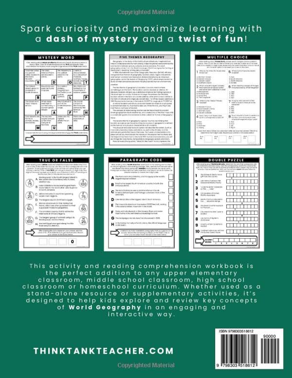 This interactive workbook teaches world geography, social studies, and reading comprehension through engaging puzzles and activities.