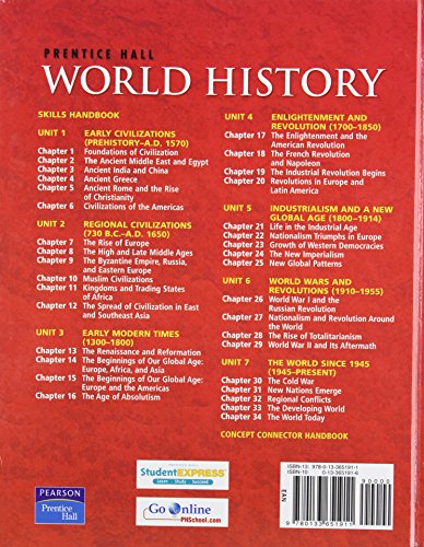 Prentice Hall World History Survey Edition Student Edition, Survey Edition Developed specifically for the first part of a two-year global history course, this text covers world history through the Enlightenment period. Some events in history are so dramatic that words alone can’t convey their impact. Moving first-person accounts, gripping visuals, and integrated audio and video make this high school world history program a fresh way to unlock world history content. Thematic concepts show students why history matters today. Writing, reading, and vocabulary, critical thinking, and note-taking instruction help students understand world history and ensure content mastery for all learners. Features and Benefits Sights and sounds of the past Integrated first-person accounts in text, audio, and video allow students to witness historical events as never before. Help students see the big ideas Our unique Concept Connector gives students the tools to systematically track key histroical themes that unfold across time and place. High-impact visuals ensure content mastery Innovative marriage between information, graphics, and interactivity helps all students understand standards-based content.