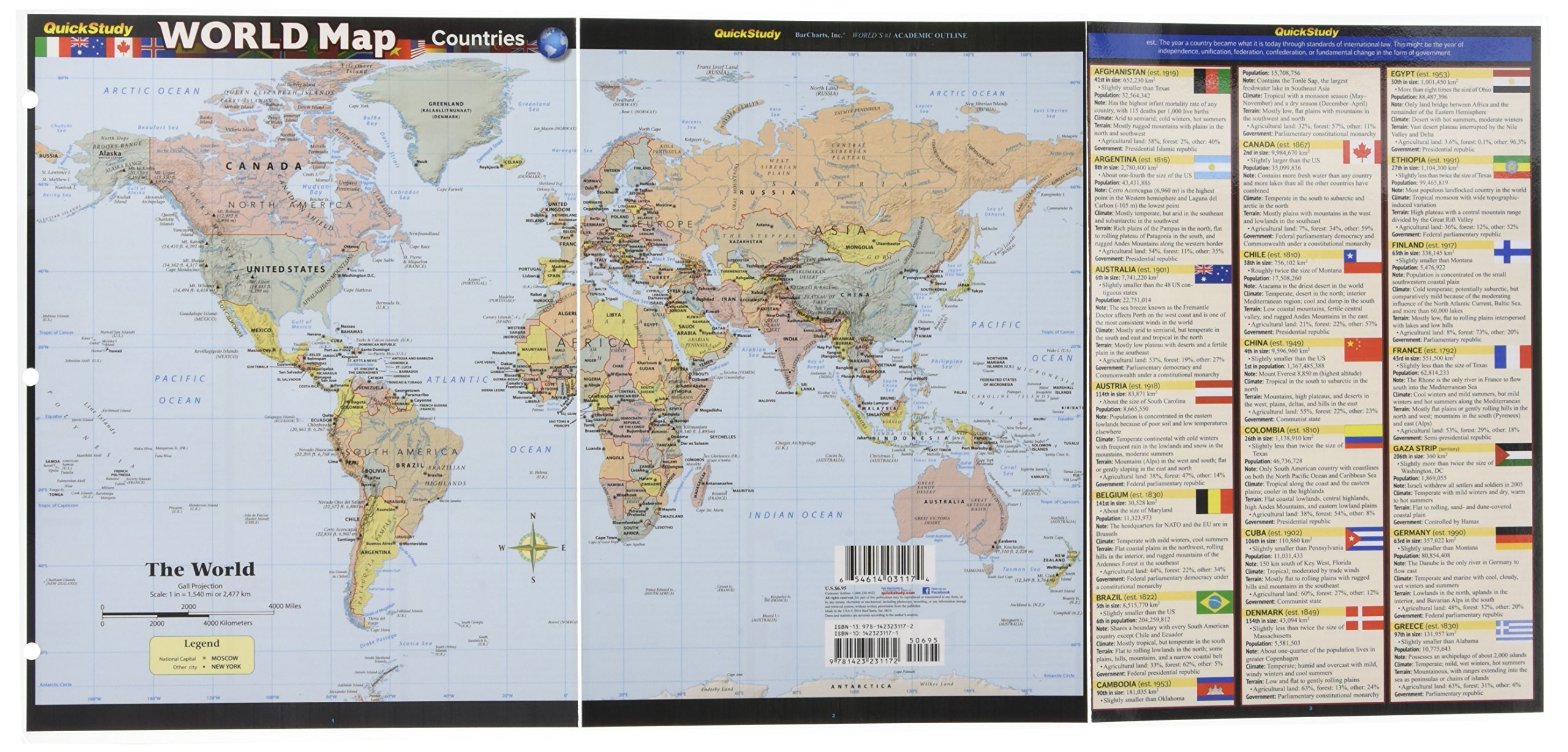 The most detailed map of the World available which can be folded and stored in a standard-size notebook. The 6 laminated pages are spill and rip-proof and include an 11″ x 17″ map and 4 pages of country facts. An essential tool for school at any level. Suggested uses: * Students – a map you can keep handy from elementary school through college * Professors – adopt this map for your course as an inexpensive supplement * Teachers – a map that can be purchased as a class set that will last your entire career * Parents – instill knowledge and interest in the world, inspire travel, and connect family history to the places on the map