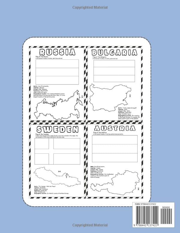 World Maps & Flags: Europe Coloring Book Learn And Color Countries Names, Capitals, Maps And Flags Around The World Great Geography Activity Book Gift For Kids And Adult Are you looking for a World Flags Coloring Book? This book specially for who looking for: maps coloring books, world flags coloring books, earth maps coloring book, countries coloring books. We take you on a journey across the world one Fag and Map at a time, starting in United States, travelling continent to continent until we reach Australia & Oceania. Each page includes the name of the country, written in clear and ready-to-color font, the national flag, map, motto, capital, largest city, population, area and geographic location. Relax and practicing mindfulness mediation while coloring these amazing geography world flags and maps. About this coloring book: * 54 Countries with Maps and Flags * The pages are a nice, large 8.5×11 size * Countries Names to coloring * High Quality Flag Outline Graphics for a superior coloring experience! * Beautiful Glossy Cover * Single sided Pages This coloring book has two purposes. The first purpose is to introduce colors, lines, forms and perceptions to young children. The second purpose is to introduce the concept of global differences. Coloring makes all these learnings possible it’s a hands-on experience. Is your child ready to absorb and retain new knowledge? Then grab a copy now! Great gift idea for Christmas , New year , Valentine’s Day and any occision. Make the perfect gift for anyone who loves coloring! Grab your coloring book now by adding to basket!!