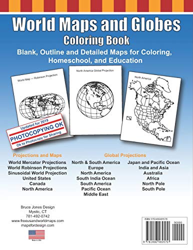Learn and color the basic geographic layout of the world with the World Maps and Globes Coloring Book. World Maps with over 70 maps is great for learning by coloring for home schools, education and even marking up a map for marketing. Blank, outline, printable maps are presented in several ways and details. Most of the maps have one page with details, often names, longitude and latitude lines and the other page a blank, outline map, great to color however you want. Students can trace the outlines of the map to get a full understanding of world geography. Black outline, blank maps included in the book are: * World Maps – Mercator Projections, including maps with individual countries * World Maps – Robinson Projections, including maps with individual countries* Sinusoidal 6 point World Projection Map, this is the orange peel one * United States Outline Maps, with and without names * Canada Maps, with and without names * Maps of North America including Canada, USA and Mexico, with and without names Also lots of Globe Maps with continents to color: North & South America, Europe, North America, South India Ocean, South America, Pacific Ocean, Middle East, Japan & Pacific Ocean, India & Asia, Australia, Africa, North Pole and the South Pole. Plus a set of 12 Globes that are turned every 30 degrees. A great collection to get your student or child into learning about the world. The printable, blank, outline maps in this coloring book can be freely photocopied by a teacher or parent for use in a classroom or for home school lessons.