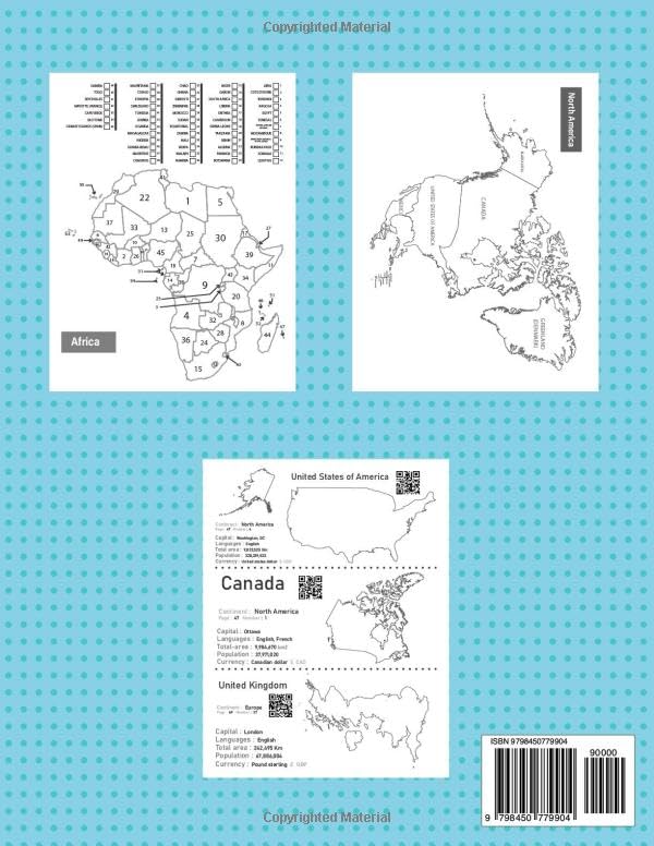 The World Regions Coloring Book offers a valuable resource for those interested in learning about world regional geography through coloring, making it useful for homeschooling and educational purposes. With this book, you can explore and color blank and outline maps depicting various regions of the world. children can benefit from tracing map outlines, studying continents, and highlighting features on the blank maps. This book serves as an excellent tool for both children and adults alike. Regions and continents of the world: Each continent map is provided in three versions: a detailed one with political borders, country names, a simplified outline map with only political borders, and a completely blank outline map for creative coloring. World Map North America Central America South America Europe Africa Asia Australia Maps of countries of the world: The book offers individual maps for over 190 countries, each providing comprehensive details such as the capital, language, area, population density, currency, and continent affiliation. These detailed maps provide valuable insight into each country separately, offering an in-depth exploration of their geographical and cultural attributes. New update: Each country’s profile features a QR code. Scanning this code redirects you to a comprehensive webpage full of detailed Information about the specific country: A summary of all the information and details available on the webpage. Flag National Emblem Map: A detailed map of the country showing its geographic features and boundaries. Location on the World Map: A reference to the country’s position on the global map. Population density Capital city Official language(s) Geographical area Currency Geography: A summary of the country’s physical features, such as mountains, rivers, forests, or plains. Culture: Highlights of the country’s traditions, arts, music, festivals, and more. Cuisine: A brief overview of the country’s signature dishes and food traditions. Government: The type of political system governing the country. Main Religion: The predominant religious belief(s) practiced in the country. Landmarks: Notable sites, historical monuments, and natural wonders found in the country. Landmarks Image: Pictures of some of the country’s landmarks. This structure provides a comprehensive overview of each nation, combining factual details with cultural highlights for a well-rounded understanding. Some other additions provided by the book: The book includes an index that facilitates navigation between pages. With each country there is a paragraph that directs you to a page to identify the location of that country on the world map.