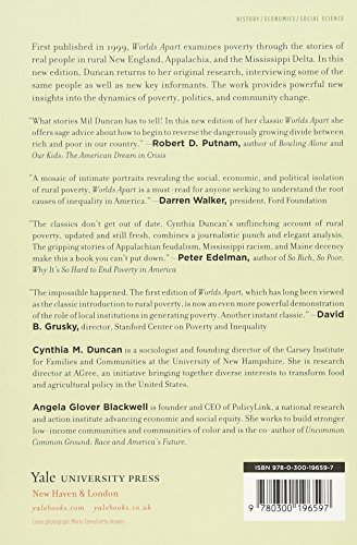 First published in 1999, Worlds Apart examined the nature of poverty through the stories of real people in three remote rural areas of the United States: New England, Appalachia, and the Mississippi Delta. In this new edition, Duncan returns to her original research, interviewing some of the same people as well as some new key informants. Duncan provides powerful new insights into the dynamics of poverty, politics, and community change. “What stories Mil Duncan has to tell! In this new edition of her classic Worlds Apart, she offers sage advice about how to begin to reverse the dangerously growing divide between rich and poor in our country.”–Robert Putnam, author of Bowling Alone and Our Kids: The American Dream in Crisis “A mosaic of intimate portraits revealing the social, economic, and political isolation of rural poverty, Worlds Apart is a must-read for anyone seeking to understand the root causes of inequality in America.”–Darren Walker, president, Ford Foundation