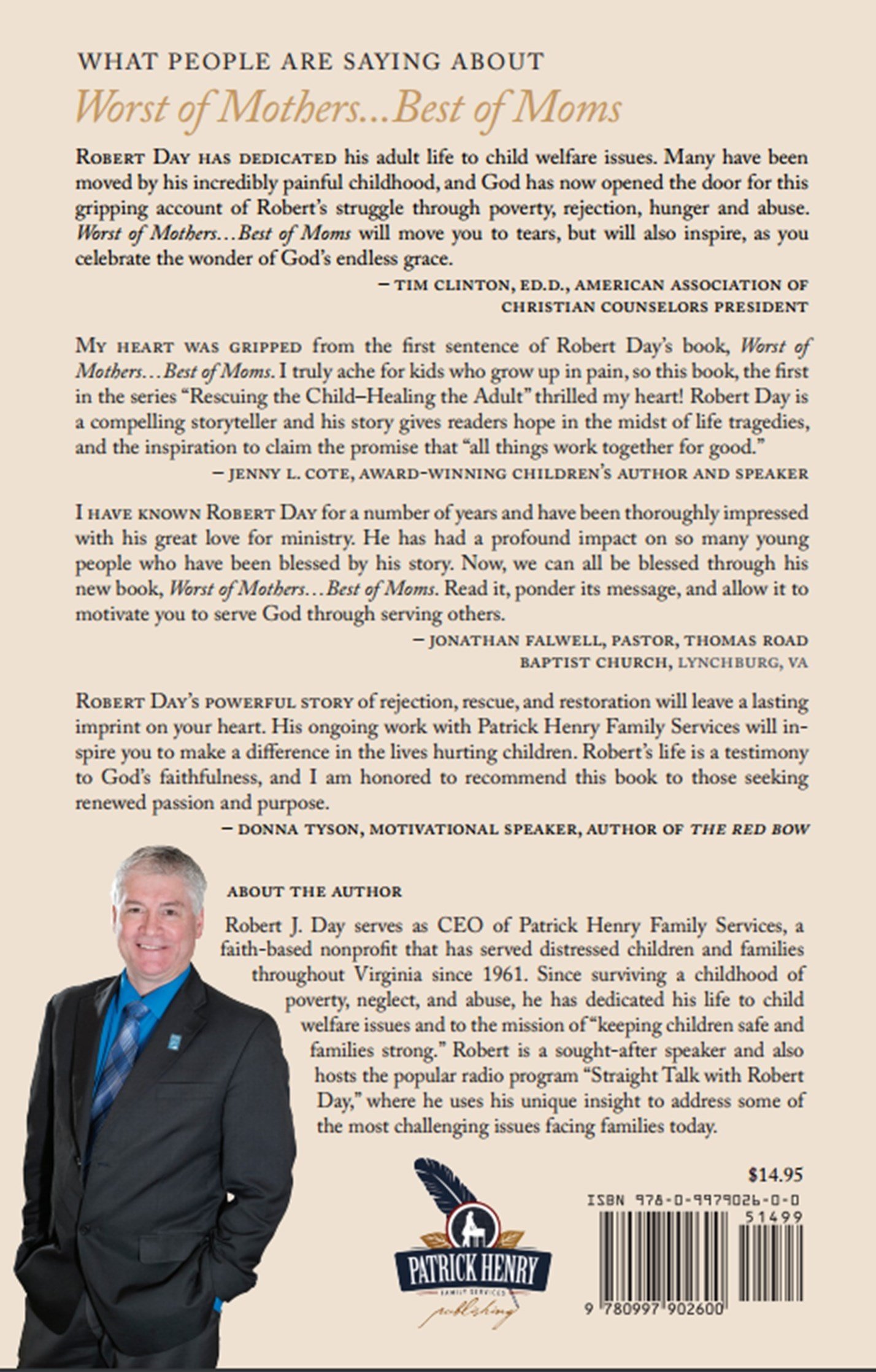 Born to an unwed, teenage mother, his childhood of poverty, neglect and unspeakable abuse included more than 35 homes before his unlikely graduation from high school. Today, as CEO of Patrick Henry Family Services, Robert Day’s life work is dedicated to keeping children safe and families strong. ‘Worst of Mothers…Best of Moms’, is a moving and inspirational story of hope and restoration, and provides a new perspective on the sovereignty of God.