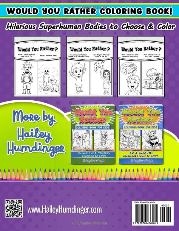 Would You Rather Coloring Book for Kids! “Hilarious Superhuman Bodies” A whimsical activity book for kids that merges the fun of “Would You Rather” questions with the joy of coloring! Each page presents a humorous and imaginative choice, such as, “Would you rather have a detachable bouncy rubber nose or a nose that can sniff out treasure” together with funny pictures to color. Would You Rather Coloring Books are an interactive and engaging way for children to explore the wonders of superhuman abilities, sparking their imagination and creativity. Perfect for young explorers who are fascinated by the world superhuman powers and bringing their colorful visions to life! Click the “buy” button now to order your Hilarious Superhuman Bodies – “Would You Rather Coloring Book” today! Size: 8.5 x 11 inches Interior: black & white, single sided coloring pages Cover: paperback, glossy