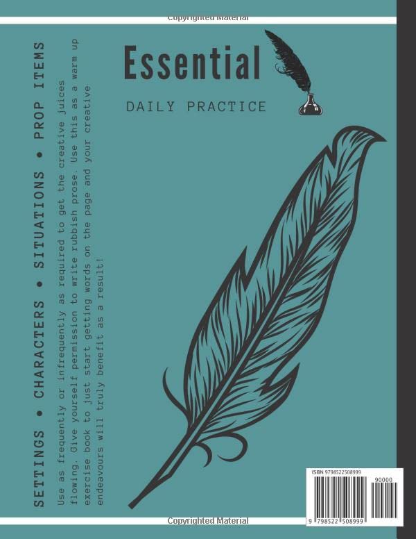 The perfect cure for that terror of the dreaded blank page. If you are productivity-minded and have set yourself the goal of writing only two pages of prose a day to grow your creative writing talents, then this book is for you (or an excellent gift). Use as frequently or infrequently as required to get the creative juices flowing. Give yourself permission to write rubbish prose. Use this as a warm up exercise book to just start getting words on the page and your creative endeavours will truly benefit as a result! This book contains a variety of short prompts, each with two lined pages for your creative writing journalling. The intention is not to create amazing fiction, but to ‘break the ice’ when it comes to writer’s block and start getting words on the page. Prompts are designed to push your imagination. Examples include: Write a story about a piece of kitchenware being used for something other than its intended purpose. Write a story about a character who is extremely possessive of an inanimate object. Include deception. One hour challenge – write about dramatic events that unfold and resolve in the space of just one hour. Include a hat. Title your piece once it is complete. Some prompts will ask you to ‘include’ something – this can be part of the plot, setting or just a part of the dialogue, as long as that element finds its way into the piece somewhere. This will help the imagination do the mental gymnastics. 8.5 x 11in on good quality paper The sooner you start, the better!