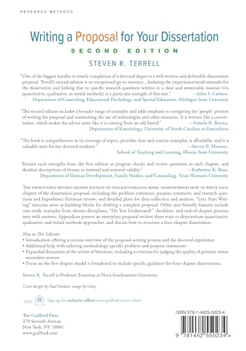 The encouraging book that has guided thousands of students step by step through crafting a strong dissertation proposal is now in a thoroughly revised second edition. It includes new guidance for developing methodology-specific problem statements, an expanded discussion of the literature review, coverage of the four-chapter dissertation model, and more. Terrell demonstrates how to write each chapter of the proposal, including the problem statement, purpose statement, and research questions and hypotheses; literature review; and detailed plans for data collection and analysis. “Let’s Start Writing” exercises serve as building blocks for drafting a complete proposal. Other user-friendly features include case-study examples from diverse disciplines, “Do You Understand?” checklists, and end-of-chapter practice tests with answers. Appendices present an exemplary proposal written three ways to demonstrate quantitative, qualitative, and mixed methods approaches, and discuss how to structure a four-chapter dissertation. New to This Edition Introduction offering a concise overview of the entire proposal-writing process and the doctoral experience. Additional help with tailoring problem and purpose statements for quantitative, qualitative, and mixed-methods studies. Expanded discussion of the review of literature, including a criterion for judging the quality of primary versus secondary sources. Many new examples from different disciplines, such as studies of depression treatments, approaches to reducing offender recidivism, health effects of irradiated crops, strength training in college football, and remote teaching and learning during COVID-19. Focus on the five-chapter model is broadened to include specific guidance for four-chapter dissertations. Broader, more detailed reference list and glossary.