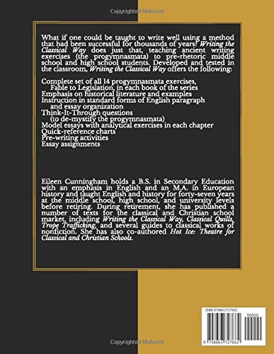 What if one could be taught to write well using a method that had been successful for thousands of years? Writing the Classical Way series does just that, teaching ancient writing exercises (the progymnasmata) to pre-rhetoric middle school and high school students. Developed and tested in the classroom, Writing the Classical Way offers the following: *Complete set of all 14 progymnasmata exercises, Fable to Legislation. *Emphasis on historical literature and examples. *Use of standard forms of English paragraph and essay organization. *Think-It-Through questions to de-mystify the progymnasmata. *Model essays with analytical exercises following in each chapter. *Quick-reference charts. *Pre-writing activities. *Essay assignments.
