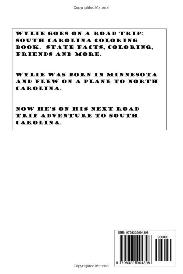 Be the first to review “WYLIE GOES ON A ROAD TRIP: SOUTH CAROLINA COLORING BOOK: WYLIE GOES ON A NEW ADVENTURE TO SOUTH CAROLINA, STATE FACTS AND COLORING ALPHABET”