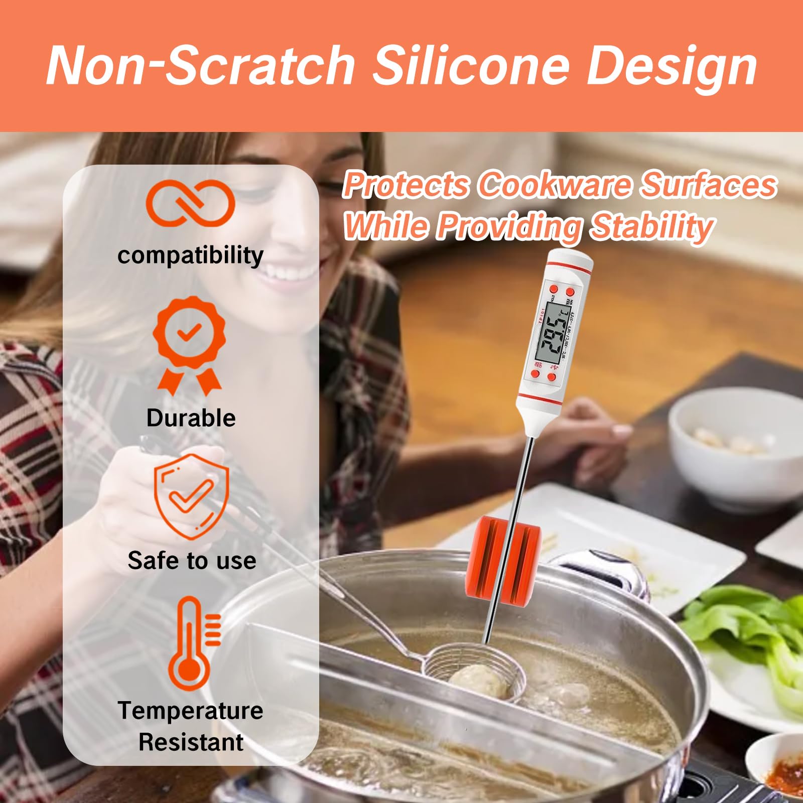 **Effortless Thermometer Placement**: Simplify your cooking experience with the Pot Clip for thermometers. This handy tool allows you to securely clip your thermometer probe onto pots, pans, and other cookware, providing stable and accurate temperature readings without the need to hold the probe in place. **Protect Your Cookware**: Say goodbye to scratched pots and pans with the Pot Clip. Crafted from soft silicone, this clip offers a non-scratch design that safeguards your cookware’s surface during use. Now you can enjoy the convenience of hands-free thermometer placement without worrying about damage. **Universal Compatibility**: Whether you’re using a digital thermometer, candy thermometer, or oil thermometer, the Pot Clip has you covered. Its versatile 3-probe size design ensures compatibility with a wide range of thermometer models, making it a practical accessory for any kitchen. **Efficiency in the Kitchen**: Take your cooking to the next level with the Pot Clip. By securely holding your thermometer probe in place, it frees up your hands to tackle other kitchen tasks while your food cooks. Enjoy the convenience of hands-free cooking without compromising on accuracy. **Safe First**: While the Pot Clip is heat-resistant up to 485degF, it’s important to exercise caution when using it near open flames or direct heat sources. The silicone material can withstand heat from the pot, but direct exposure to fire should be avoided to prevent damage.