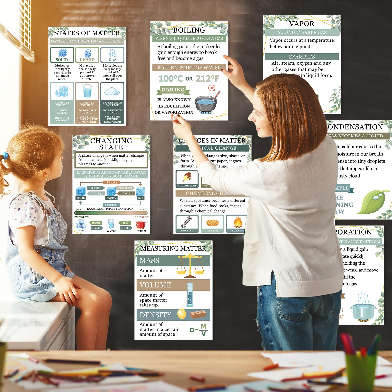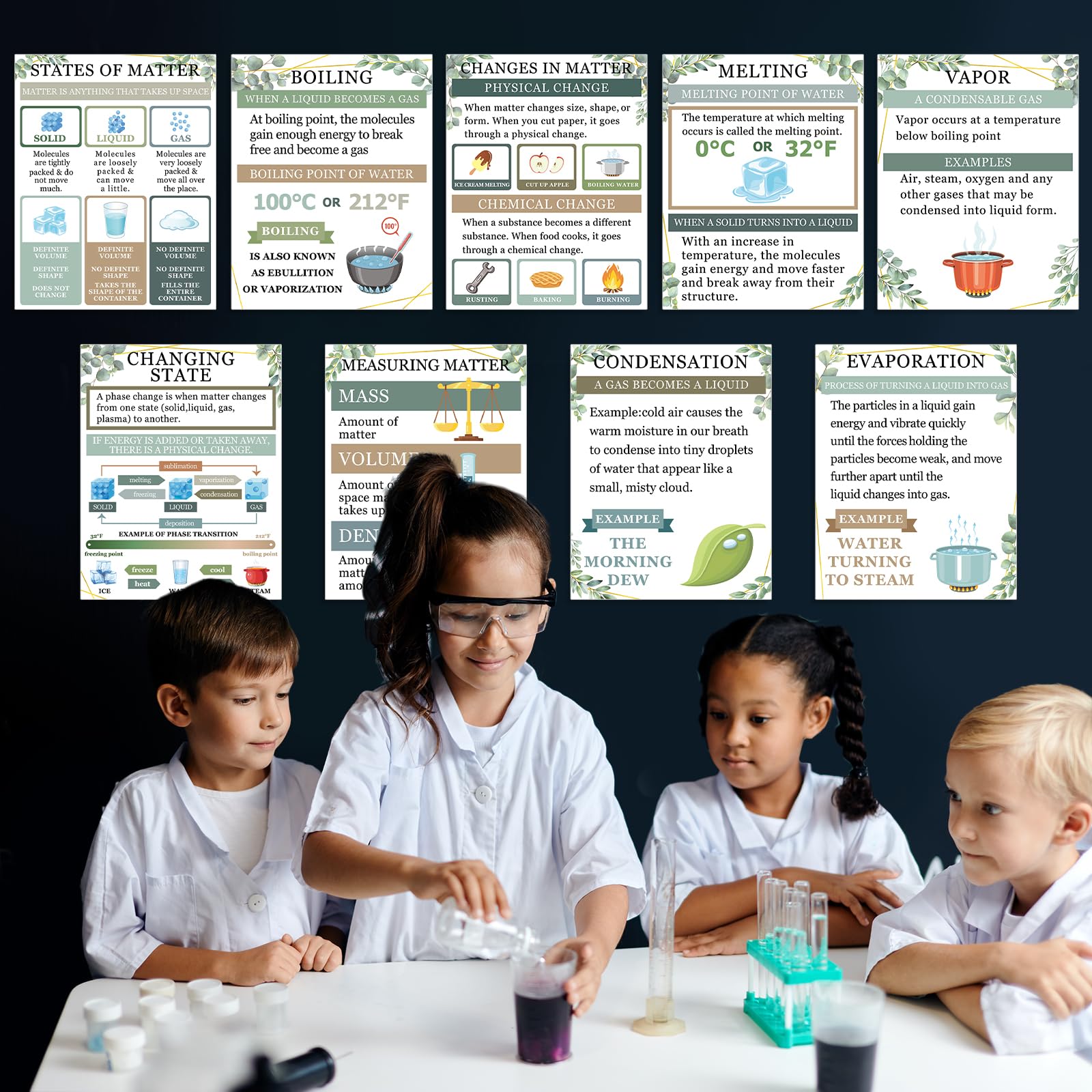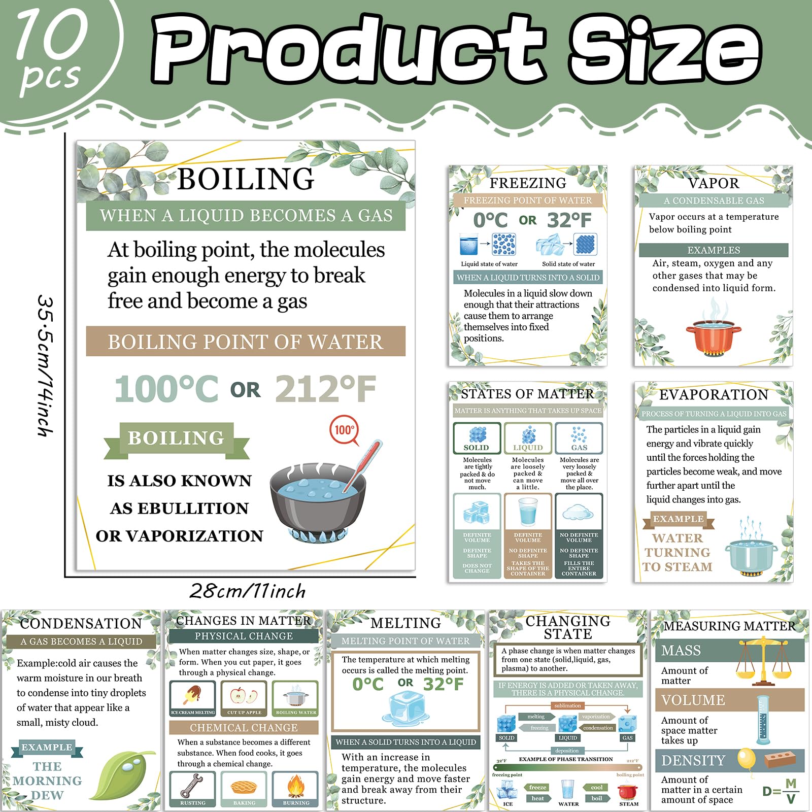 - Comprehensive coverage: The greenery anchor charts physics educational bulletin board decorations cover a wide range of important topics related to matter in chemistry. They include elements, vapor, boiling, states of matter, freezing, changing state, melting, changes in matter, evaporation, condensation, and measurement matter. Each science poster is designed to simplify and visually represent essential concepts, helping students engage with the material and improve retention.