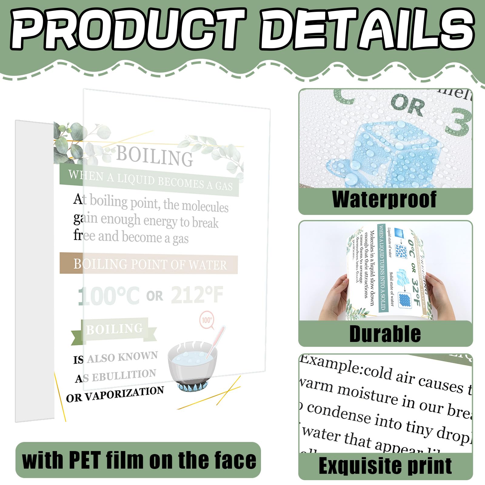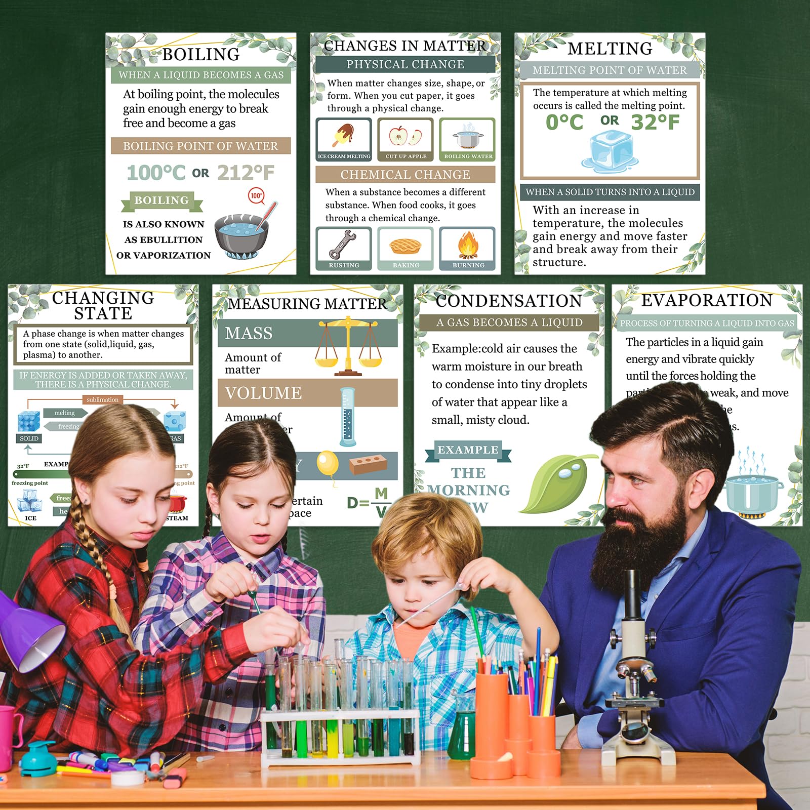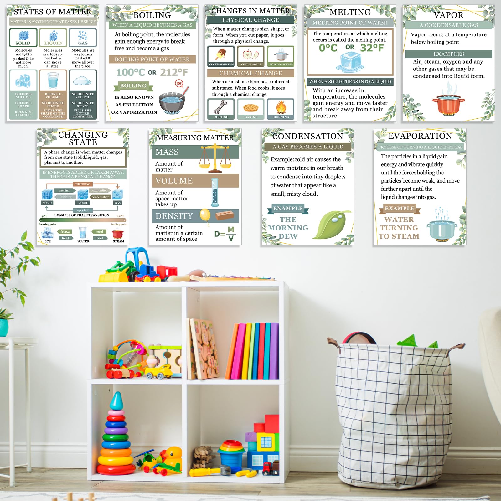 - Comprehensive coverage: The greenery anchor charts physics educational bulletin board decorations cover a wide range of important topics related to matter in chemistry. They include elements, vapor, boiling, states of matter, freezing, changing state, melting, changes in matter, evaporation, condensation, and measurement matter. Each science poster is designed to simplify and visually represent essential concepts, helping students engage with the material and improve retention.