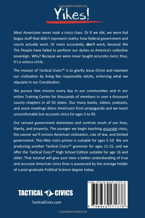Most Americans never took a civics class. Or if we did, we were fed bogus stuff that didn’t represent reality: how federal government and courts actually work. Or more accurately, don’t work, because We The People have failed to perform our duties as America’s collective sovereign. Why? Because we were never taught accurate civics; thus, it’s a vicious circle. The mission of Tactical Civics(tm) is to glorify Jesus Christ and maintain our civilization by living like responsible adults, enforcing what we stipulate in our Constitution. We pursue that mission every day in our communities and in our online Training Center for thousands of members in well over a thousand county chapters in all 50 states. Our many books, videos, podcasts, and zoom meetings detox Americans from propaganda and teach uncomfortable but accurate civics for ages 5 to 95. Our servant government dominates and controls much of our lives, liberty, and property. The younger we begin teaching accurate civics, the sooner we will restore American civilization, rule of law, and limited government. This little civics primer is suitable for ages 5-10. We are producing another Tactical Civics(tm) grammar for ages 11-15, and we already offer the Tactical Civics(tm) High School Edition suitable for ages 16 and older. That tutorial gives your teen a better understanding of true and accurate American civics than is possessed by the average post-graduate in Political Science today. With this first primer, your 5-10 year old child can set the record straight when engaging political activists of any age or party.