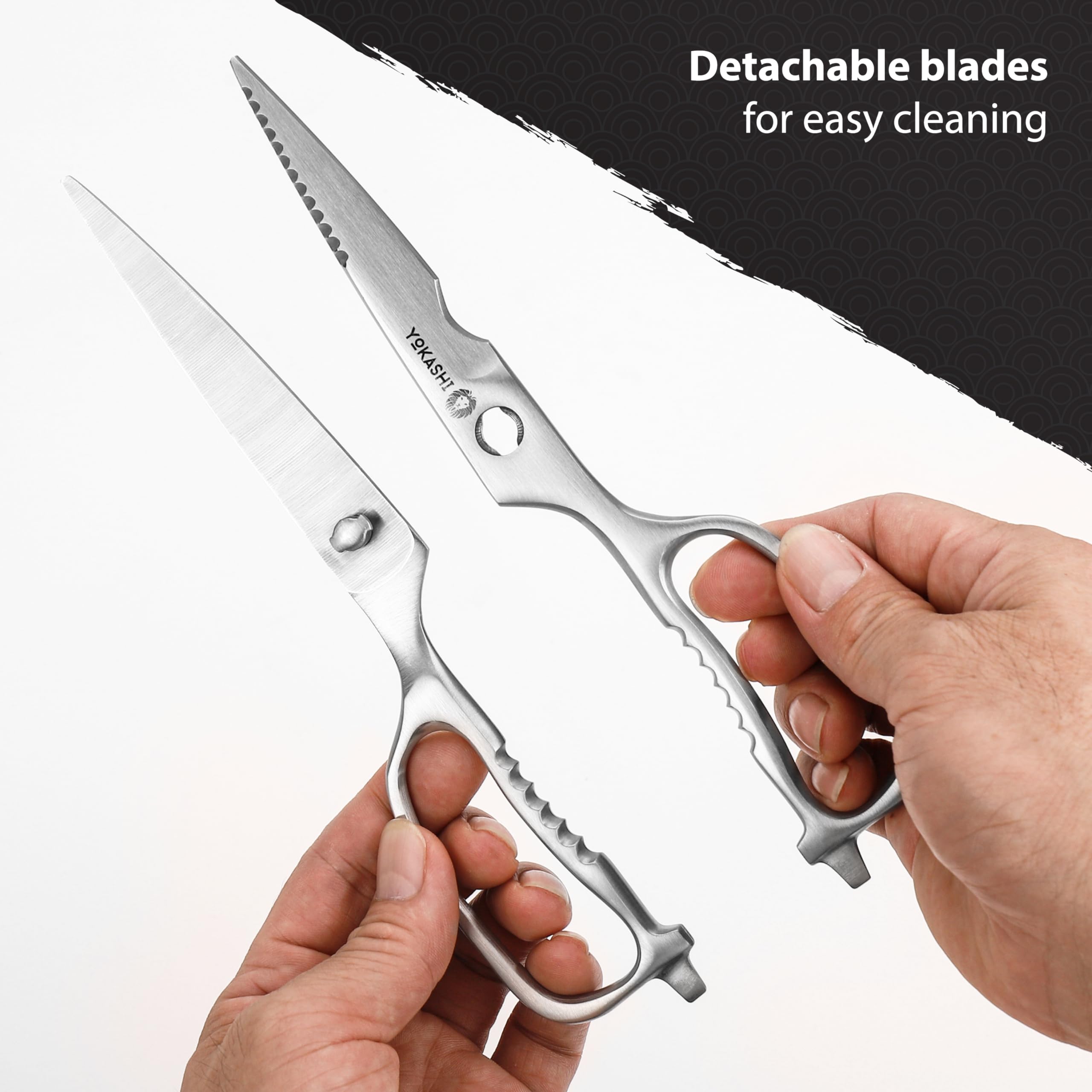 - [(EASY TO CLEAN)] With detachable, dishwasher-safe blades, these kitchen scissors are a breeze to clean. Versatile and stain-resistant, they handle a range of tasks from cutting seafood to trimming flower stems, making them indispensable cooking shears in any kitchen.