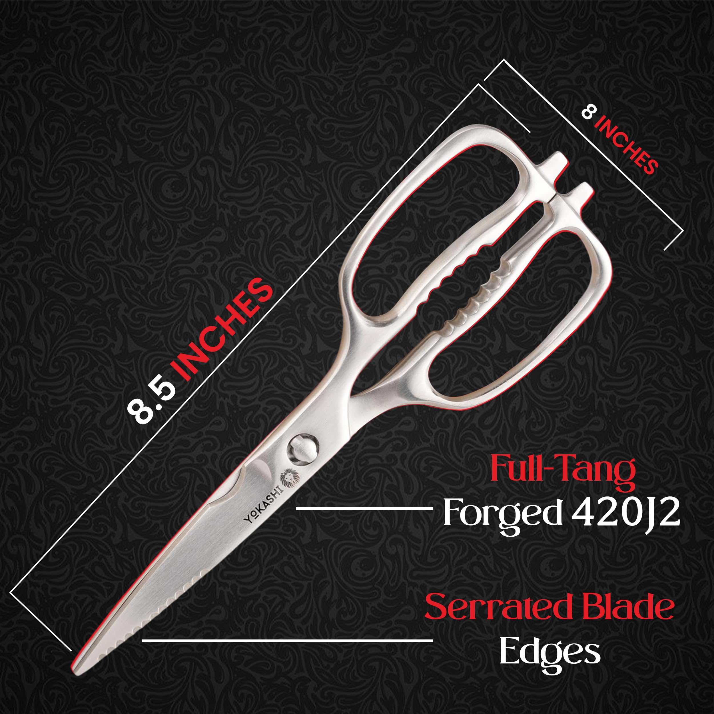 - [(PREMIUM STAINLESS STEEL)] These multipurpose kitchen shears are crafted from forged Japanese stainless steel (420J2 grade), known for superior corrosion resistance and strength. Ideal for heavy duty tasks, they ensure lasting durability and performance, making them essential kitchen accessories.