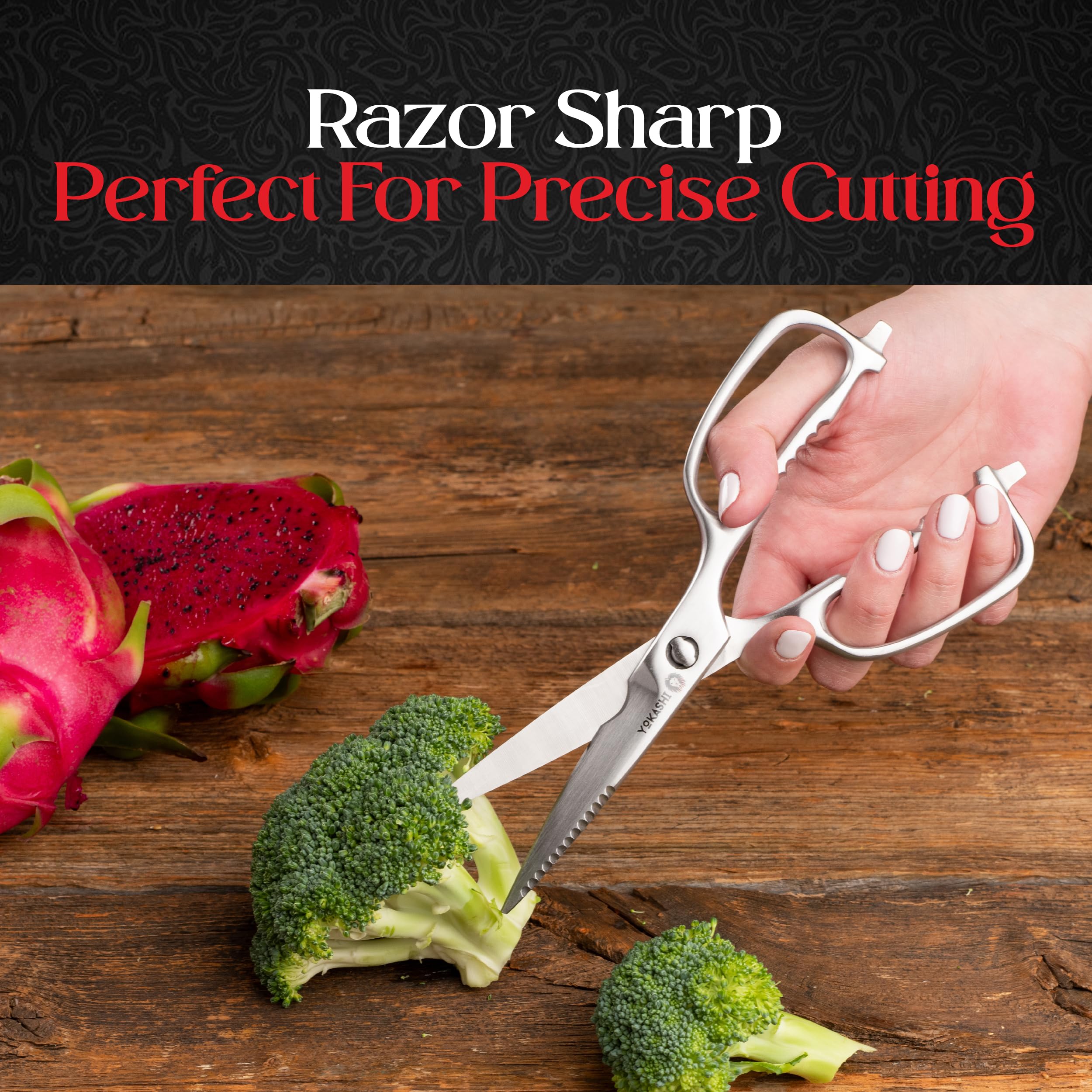 - [(SUPER SHARP & ANTI-SLIP)] Featuring micro-serrated blades, these sharp kitchen scissors provide precise cutting of meat, chicken, fish, and vegetables. The ergonomic, ambidextrous anti-slip handle ensures a secure grip, making these heavy duty kitchen scissors effortless and safe for intricate tasks.