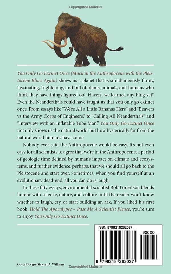 YOU ONLY GO EXTINCT ONCE (Stuck in the Anthropocene with the Pleistocene Blues Again) shows us a planet that is simultaneously funny, fascinating, frightening, and full of plants, animals, and humans who think they have things figured out. Haven’t we learned anything yet? Even the Neanderthals could have taught us that you only go extinct once. From essays like “We’re All a Little Bananas Here” and “Beavers vs the Army Corps of Engineers,” to “Calling All Neanderthals” and “Interview with an Inflatable Tube Man,” YOU ONLY GO EXTINCT ONCE not only shows us the natural world, but how hysterically far from the natural world humans have come. Nobody ever said the Anthropocene would be easy. It’s not even easy for all scientists to agree that we’re in the Anthropocene, a period of geologic time defined by human’s impact on climate and ecosystems, and further evidence, perhaps, that we should all go back to the Pleistocene and start over. Sometimes, when you find yourself at an evolutionary dead-end, all you can do is laugh. In these fifty essays, environmental scientist Bob Lorentson blends humor with science, nature, and culture until the reader won’t know whether to laugh, cry, or start building an ark. If you liked his first book, HOLD THE APOCALYPSE – PASS ME A SCIENTIST PLEASE, you’re sure to enjoy YOU ONLY GO EXTINCT ONCE. Excerpts: From “Wouldn’t You Like to Be a Prepper Too?”: An apocalypse is no time to discover that time goes twice as slow in a bunker, and toilet paper twice as fast. From “A Modern Guide to Thinking”: If you find yourself saying, What were they thinking? more than usual these days, perhaps it’s time to take a closer look at an activity that some think back on as the foundation of humanity, while others think ahead and just see the ruins. From “The Opossum – America’s National Shame”: While other mammals were busy evolving into fascinating creatures like horses, foxes, and bison, opossums are a 65-million-year-old reminder of what happens when you don’t even try. From “How to Resurrect Will Cuppy”: The animals spoke to him in ways that people didn’t, although in the city it took a fine ear to tell the difference. From “Animals on Drugs”: Sometimes I have to wonder if the whole planet isn’t made of locoweed.