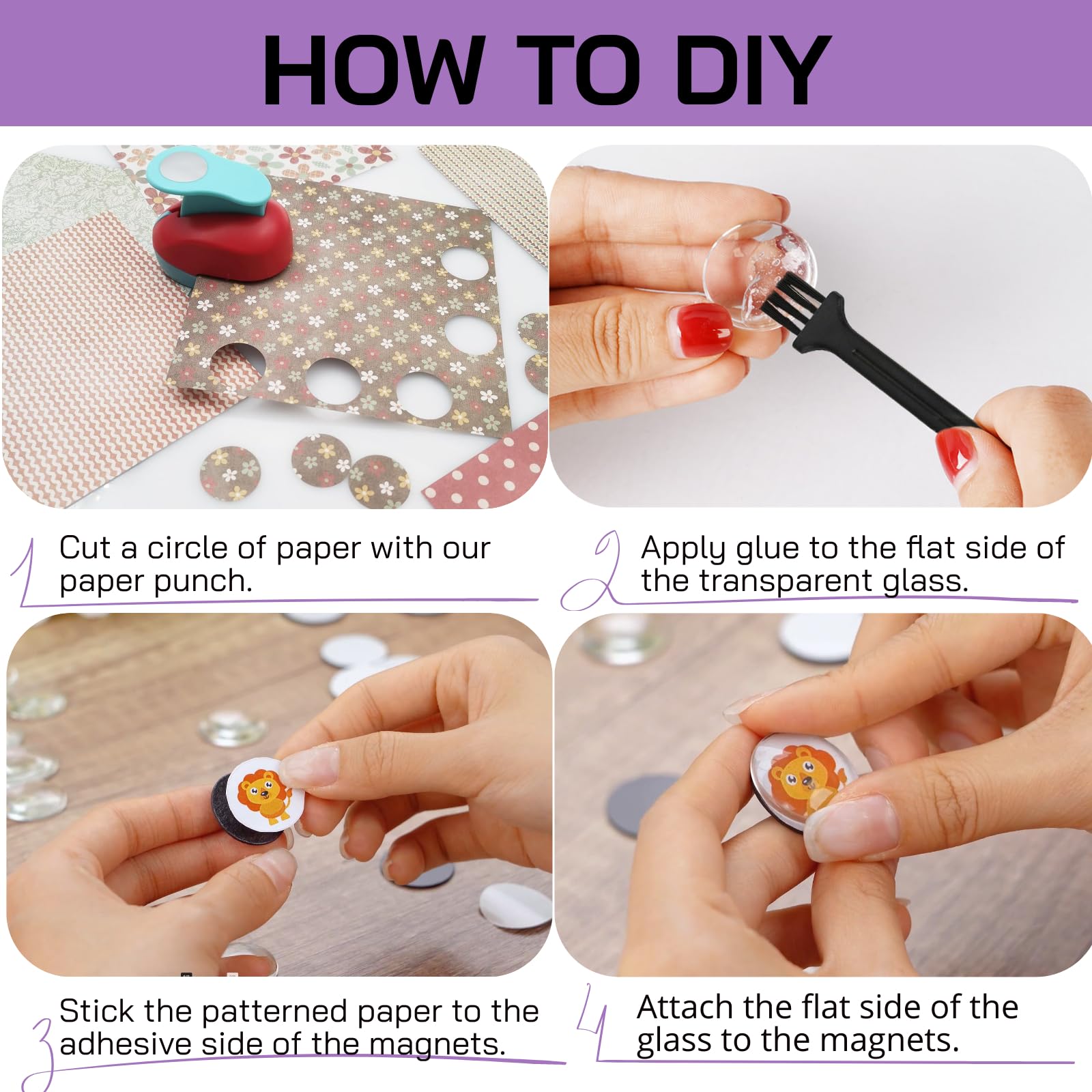 - Package includes: Our clear craft magnets set includes 1 piece craft paper punch (color at random), 50 transparent round glass cabochons and 50 magnetic discs, providing ample quantity for your DIY refrigerator magnets and craft projects.