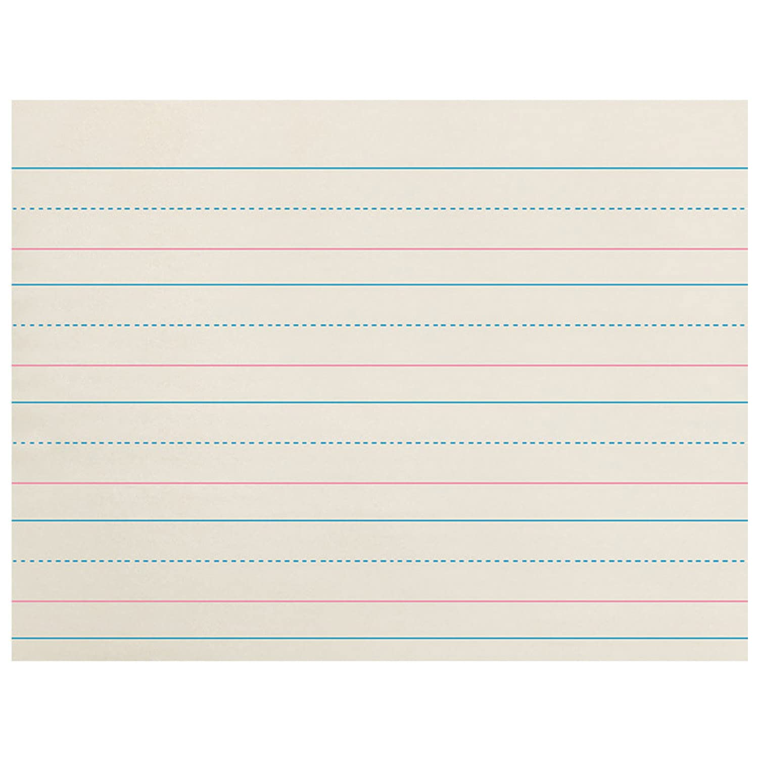 - Clean white newsprint that’s 1-1/8″ ruled on both sides with 9/16″ blue dotted midline, red baseline and 9/16″ skip space