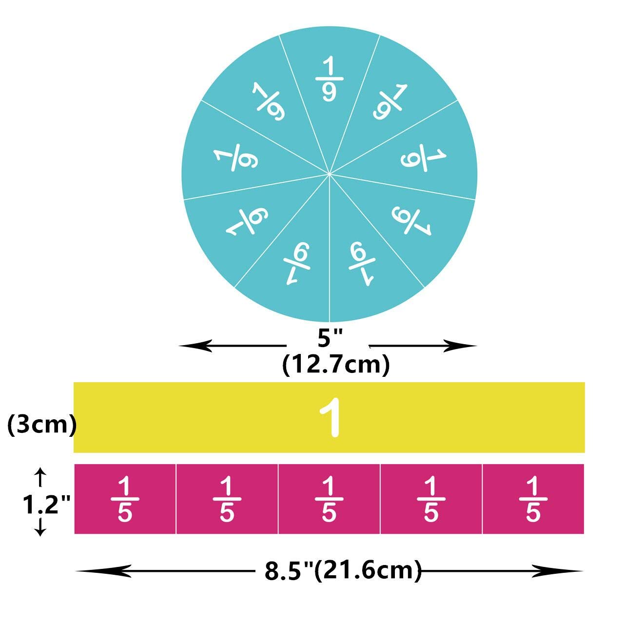 - 12 Whole Fraction Tiles – each measures 8.5 x 1.2 inches; 12 Fraction Circles – each measures 5 inches Dia.