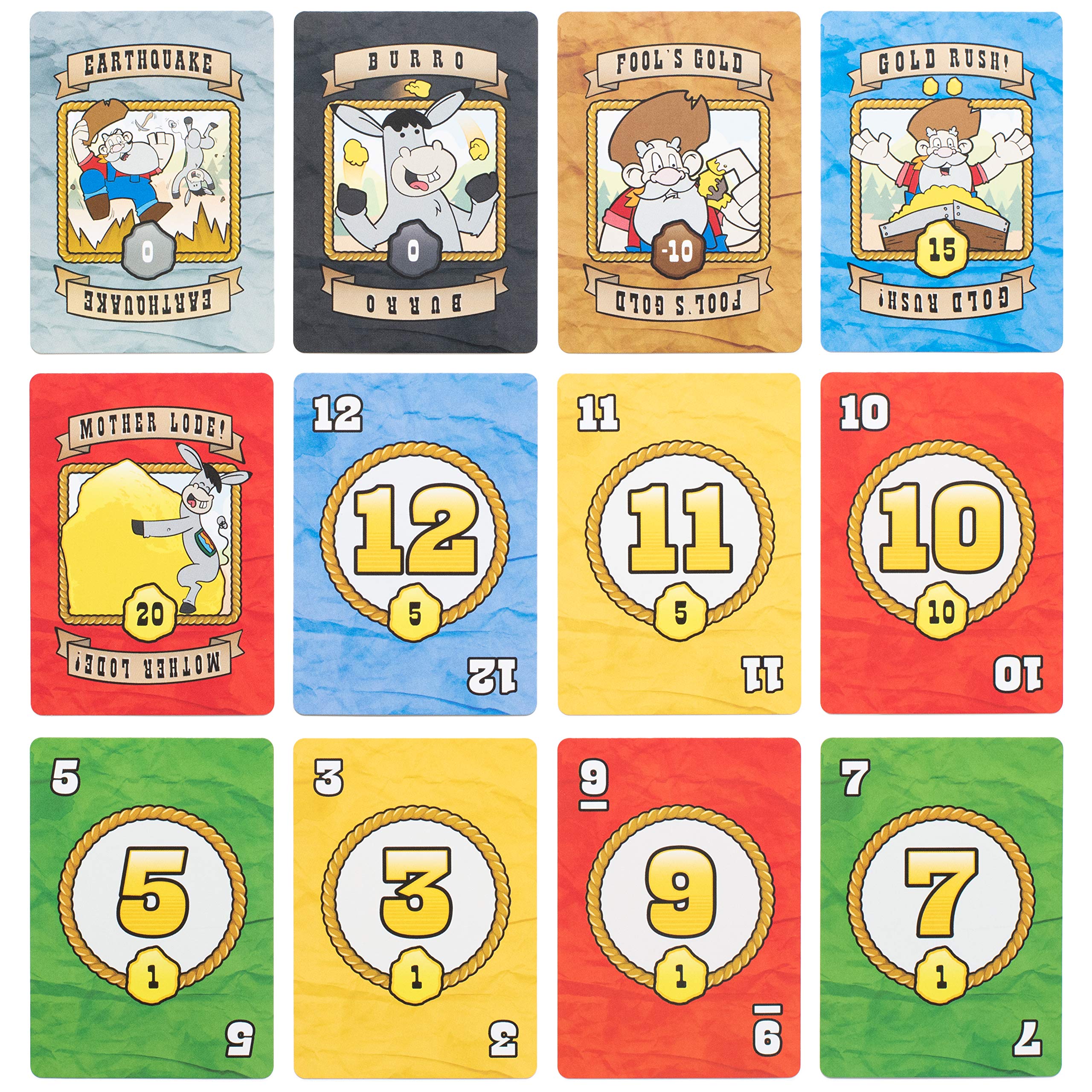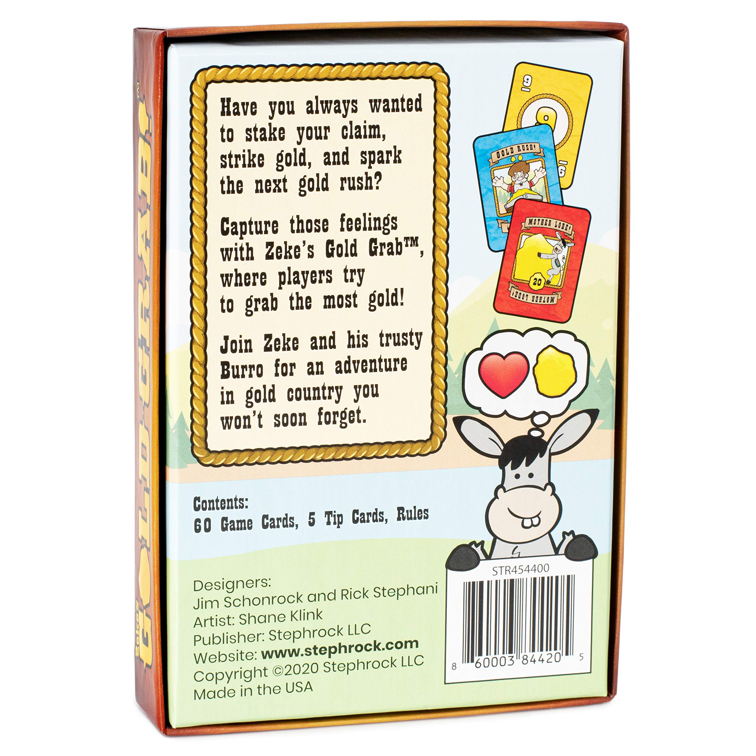 - FUN IS IN THE BOX: Zeke’s Gold Grab includes 60 colorfully designed, character-driven cards, game instructions, and 5 quick-tip cards for easy reference. As an added bonus, the unique scoring system doubles as an educational game for kids by helping younger players learn and practice basic addition and subtraction skills. Join Zeke and Burro in the hills of Gold Country and begin your quest for gold (and FAMILY FUN!) today.