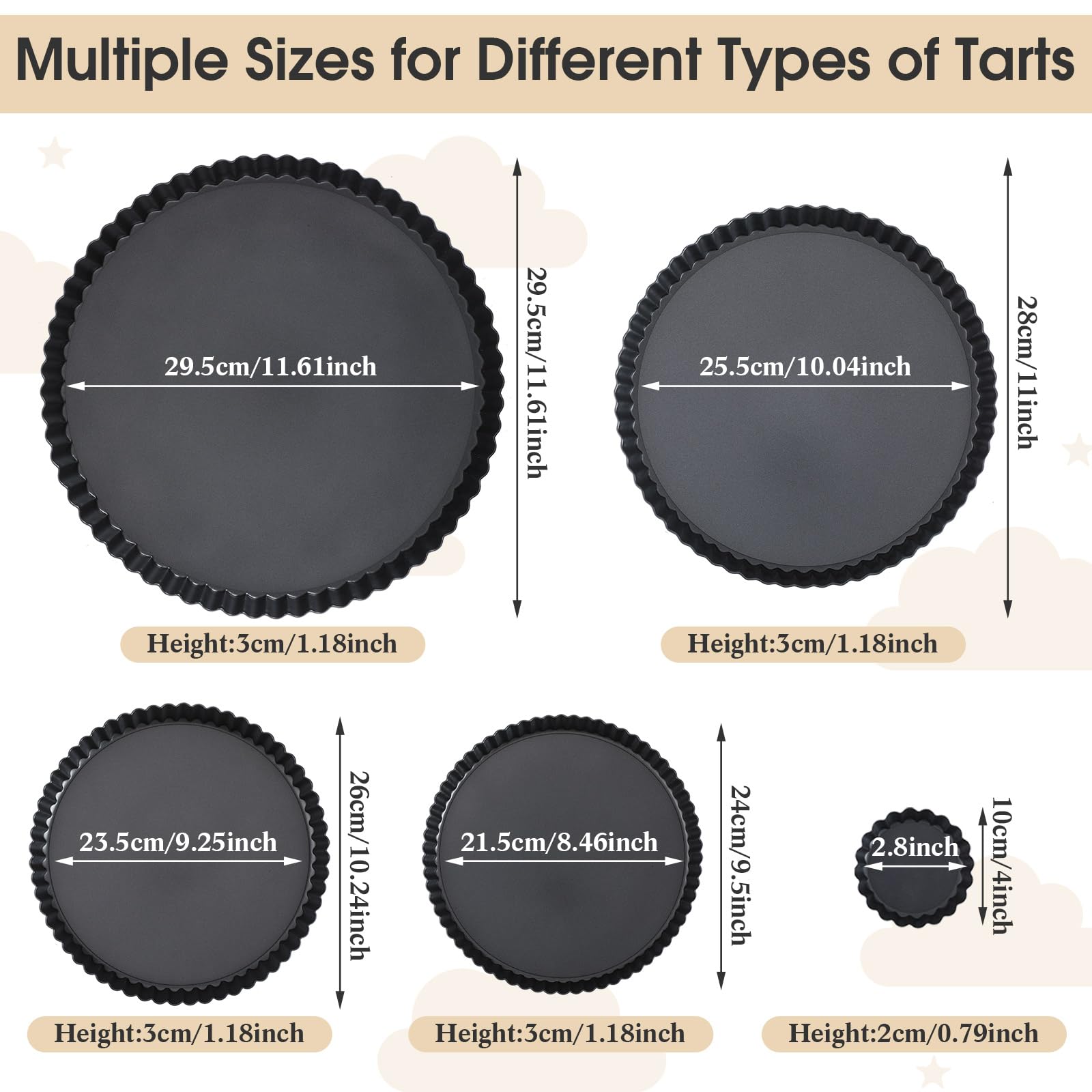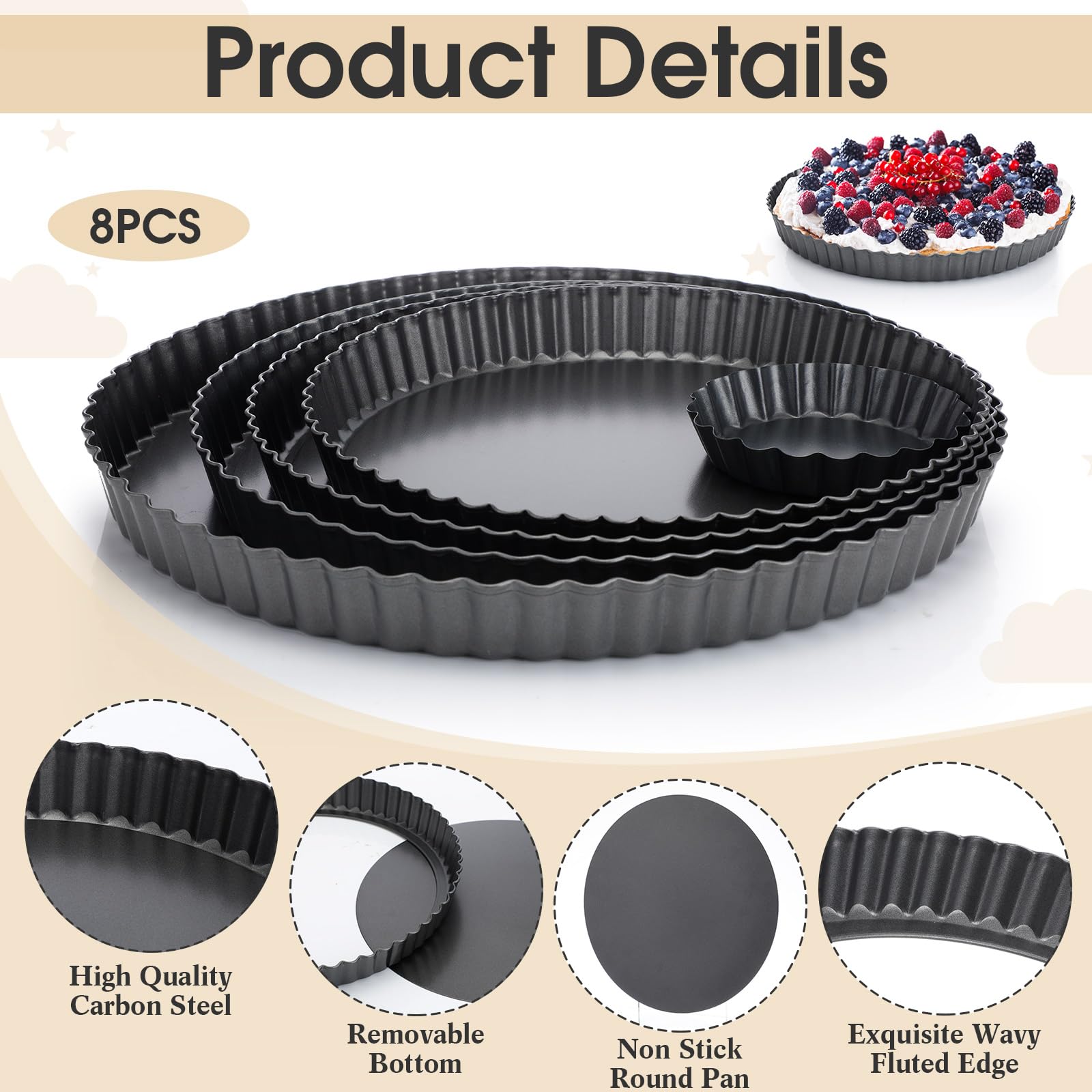 Ziliny 8 Pcs Non Stick Tart Pan 4'' 9.5" 10" 11" 12.6" Quiche Round Carbon Steel Mini Pie Pans with Removable Bottom Fluted Edges for Mousse Cakes, Dessert Baking, Christmas Party, 5 Sizes