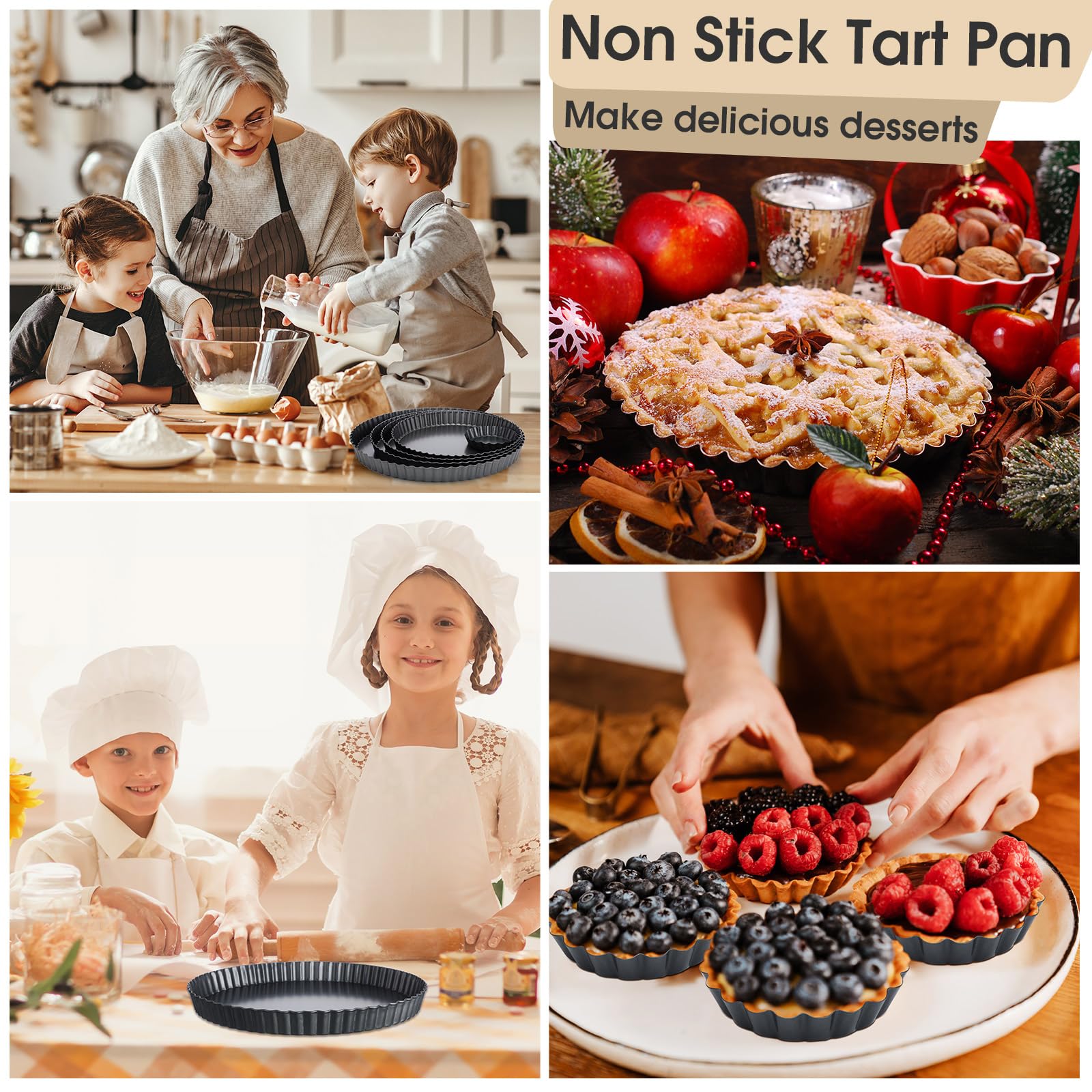 • Package Includes: you will get 8 round tart pans with removable bottoms, including 4 pieces of 4 inch mini tart pans, 1 piece 9.5 inch pie pan, 1 piece 10 inch quiche pan, 1 piece 11 inch round baking pan and 1 piece of 12.6 inch non stick baking pan; The quantity is abundant, and the styles are complete, 5 different sizes of tart pans meet your different needs and make your baking process full of fun