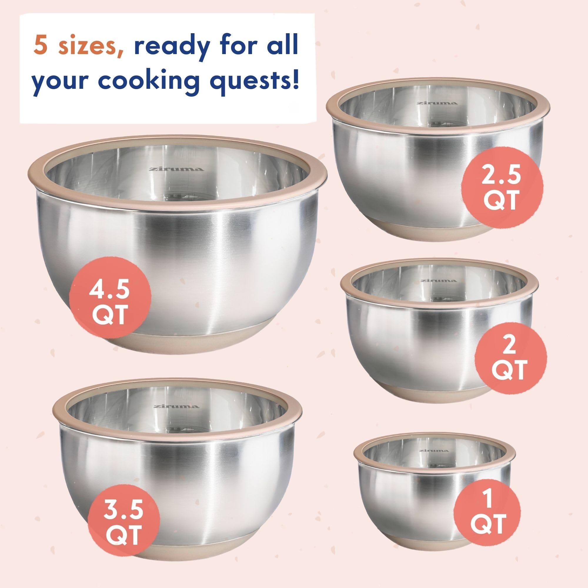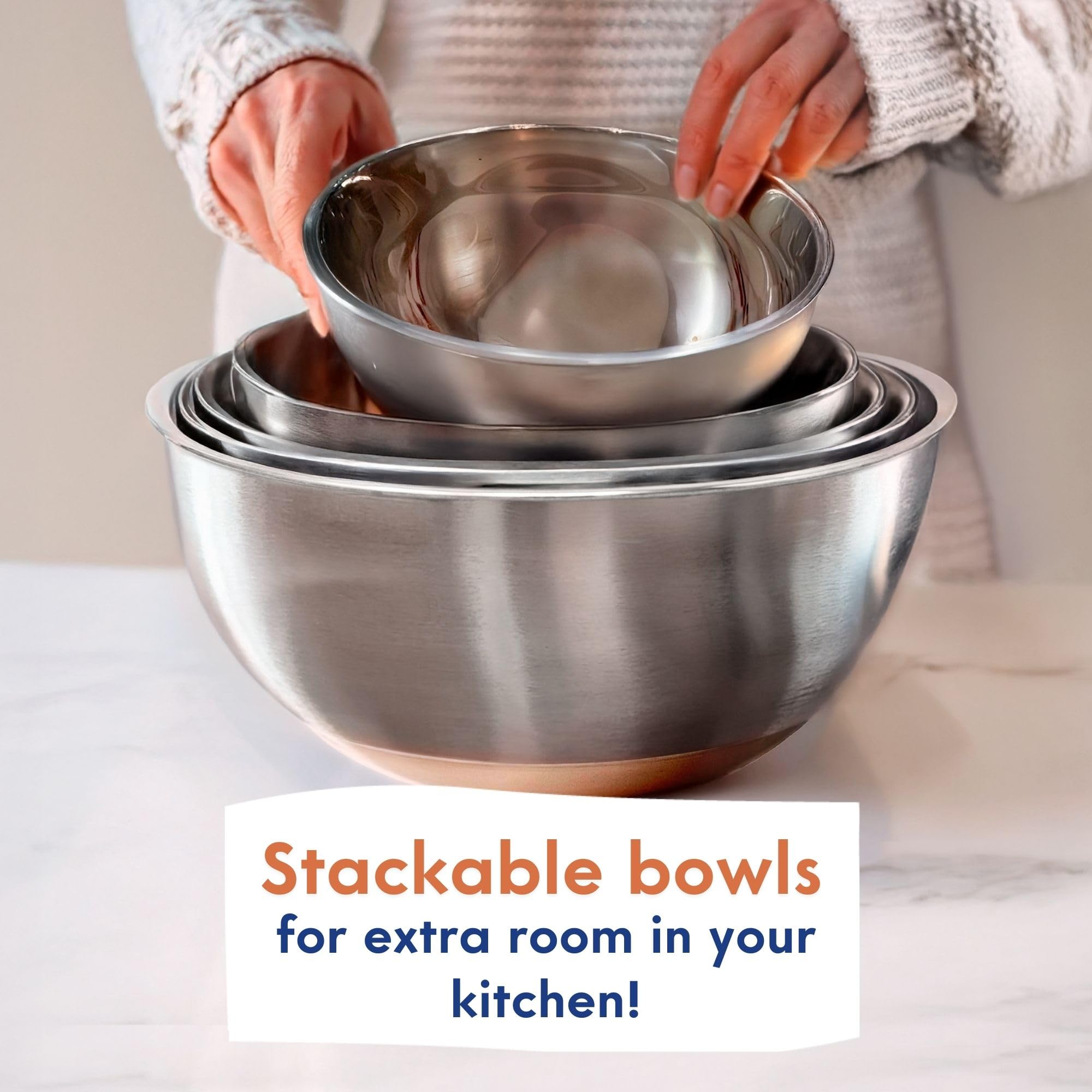Mix, Prep & Store with Ease – No matter the recipe, this stainless steel mixing bowl set has the perfect size. Includes 1, 2, 2.5, 3.5 & 4.5 qt bowls–great for baking, meal prep, and more!