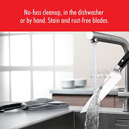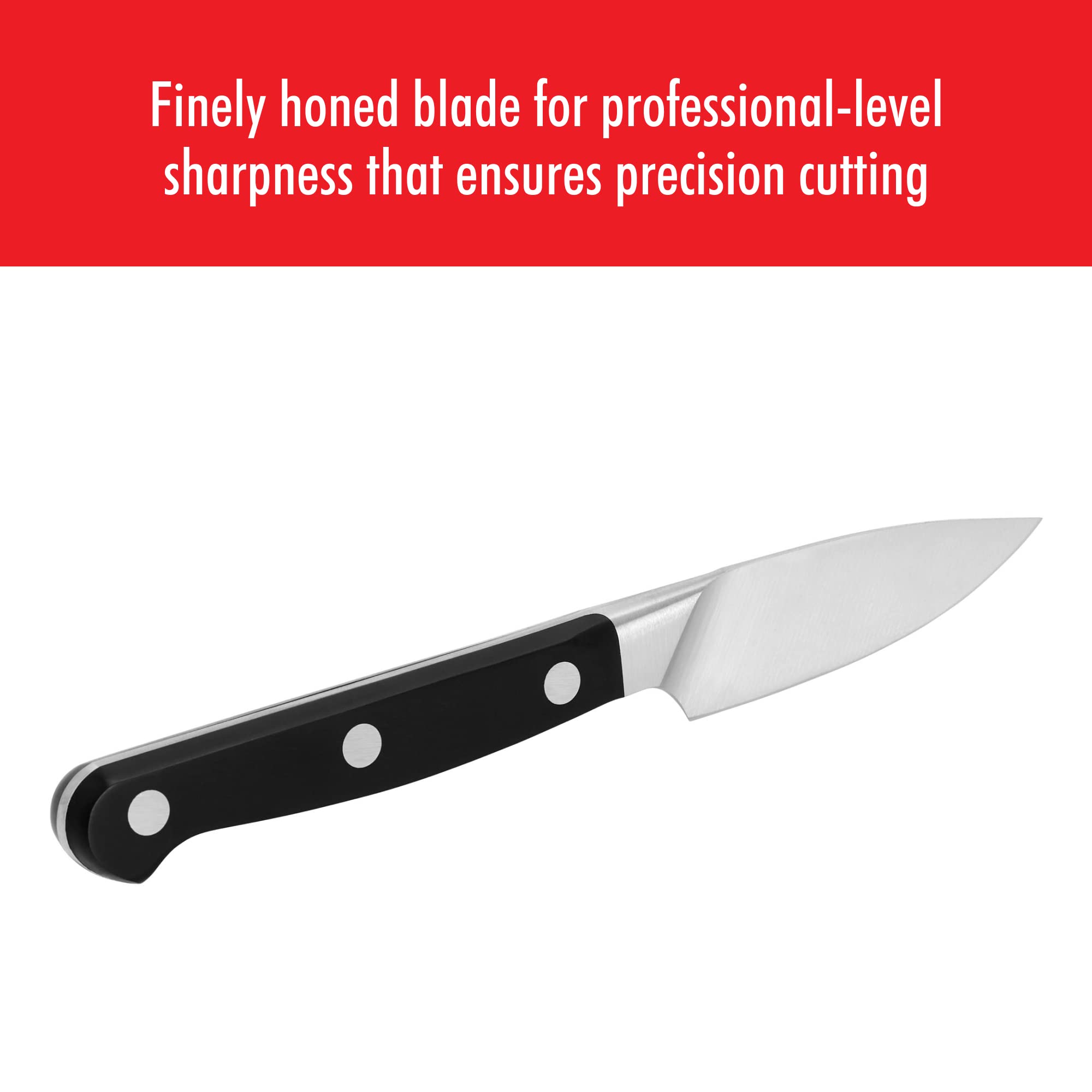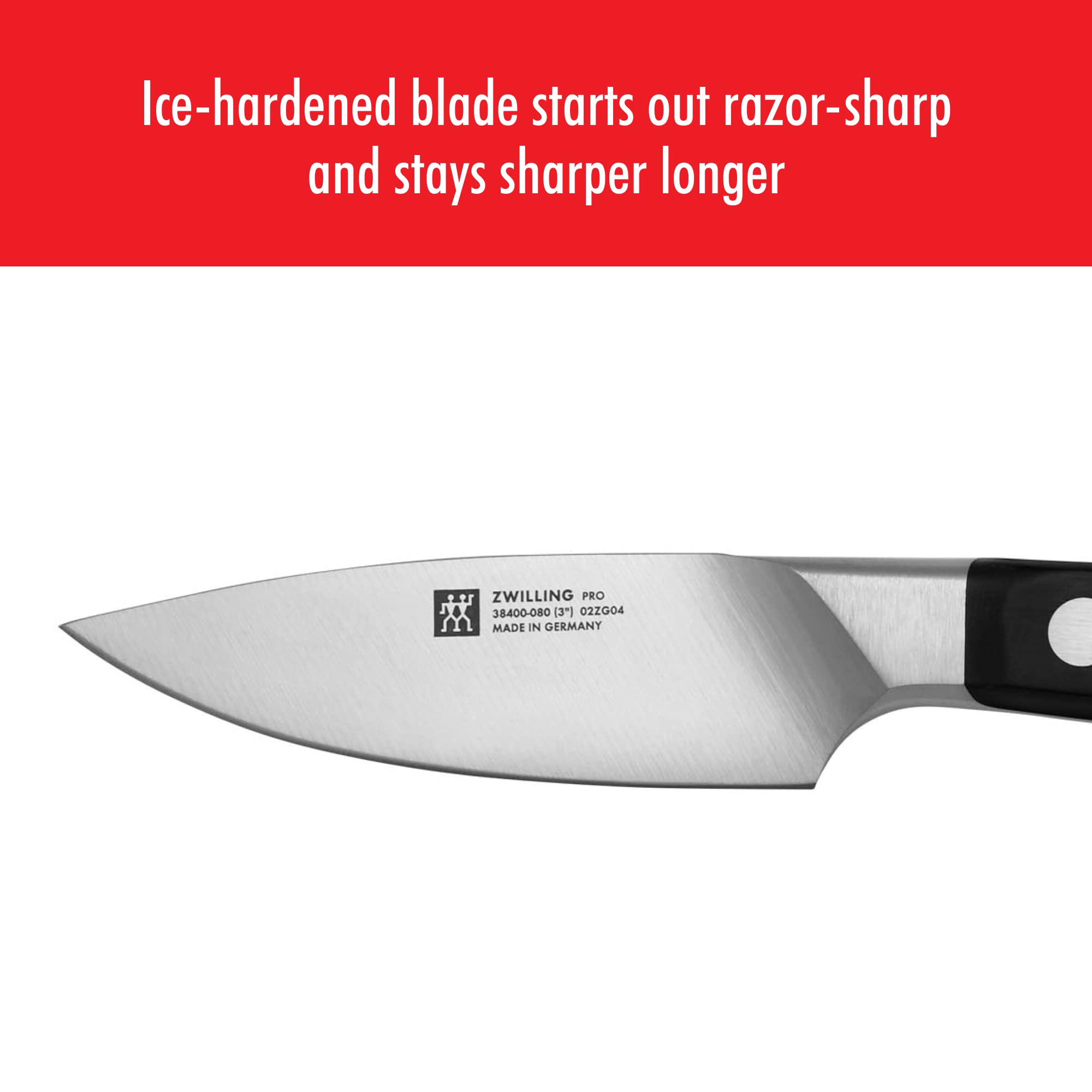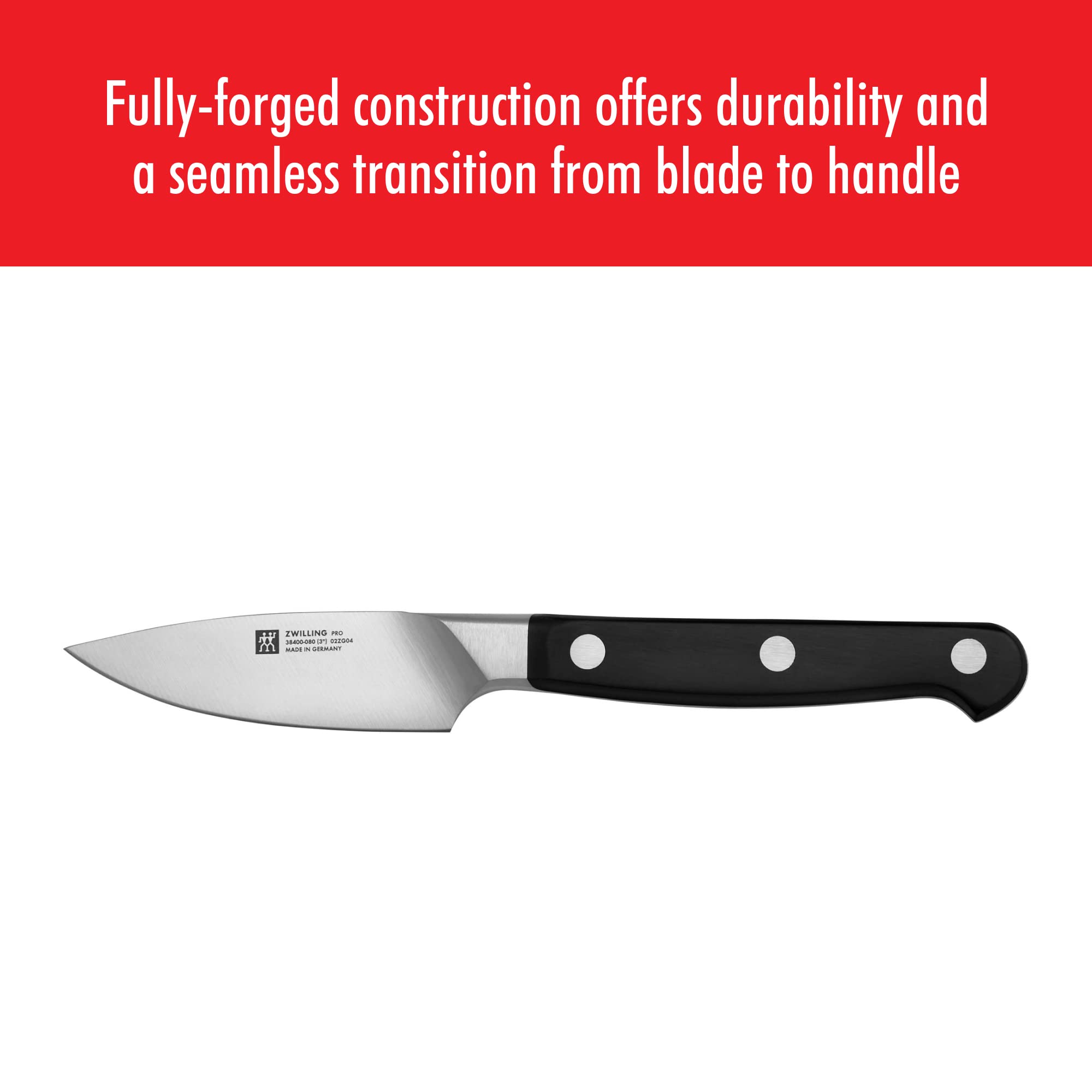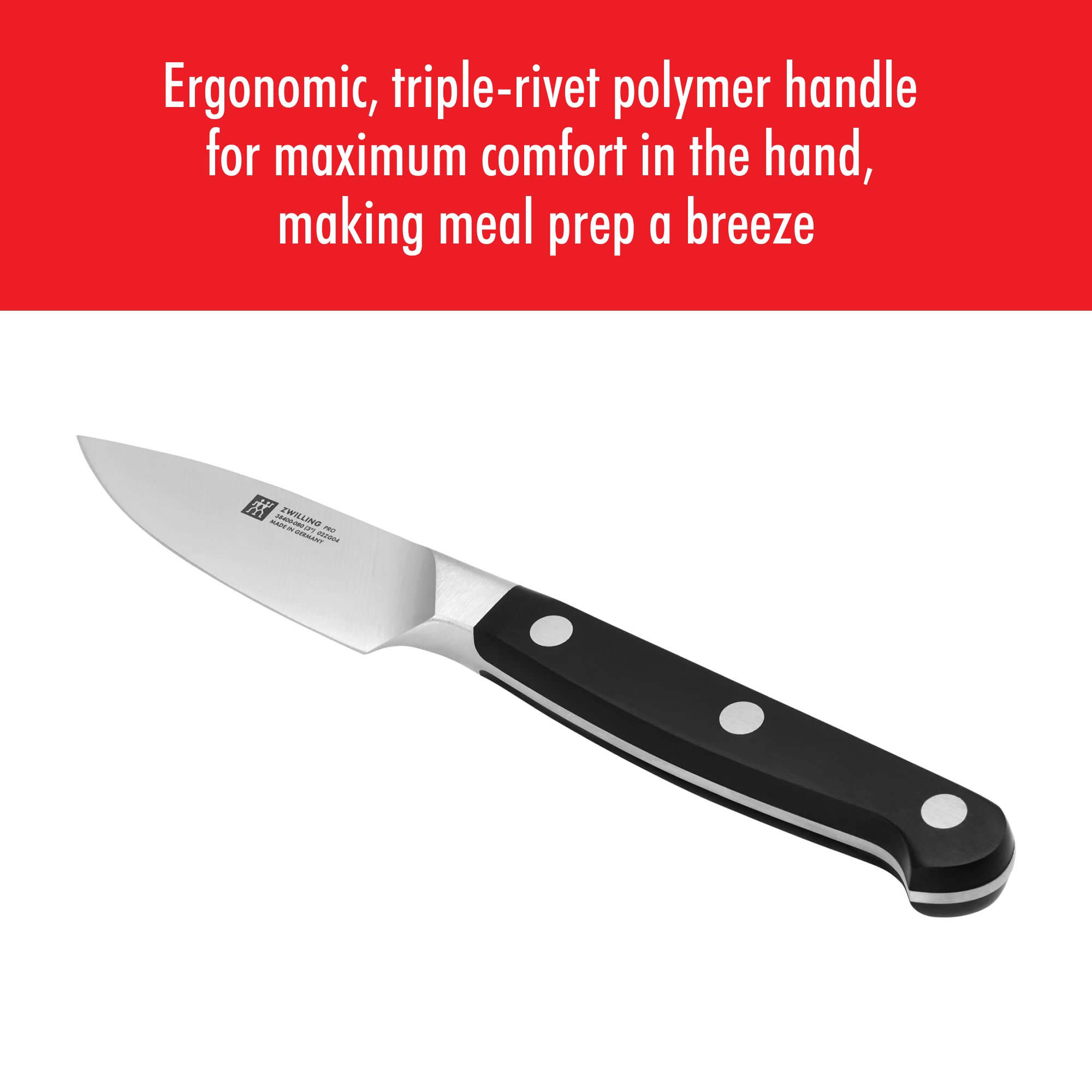 ZWILLING Pro is the most user-friendly knife available to market. The unique blade shape and ergonomic bolster are the result of 280 years of experience in knife making, and the rigorous Study of how knives are used. A unique curved bolster supports the professional pinch grip, with thumb and index finger on the blade, for safe cutting and less fatigue. The blade was redesigned with a broader curve in the front to facilitate the rocking motion of western cutting, while the straight back is ideal for the Asian chopping motion. The full length of the blade can be used when cutting and can be sharpened from bolster to tip designed in Italy by matteo thun and made in Germany by ZWILLING J.A. HENCKELS, the company that sets the standard for exceptional cutlery worldwide. The zwilling Pro Paring knife is a small knife with a strong blade and center tip. It is ideal for cleaning, peeling and cutting small fruits and vegetables.