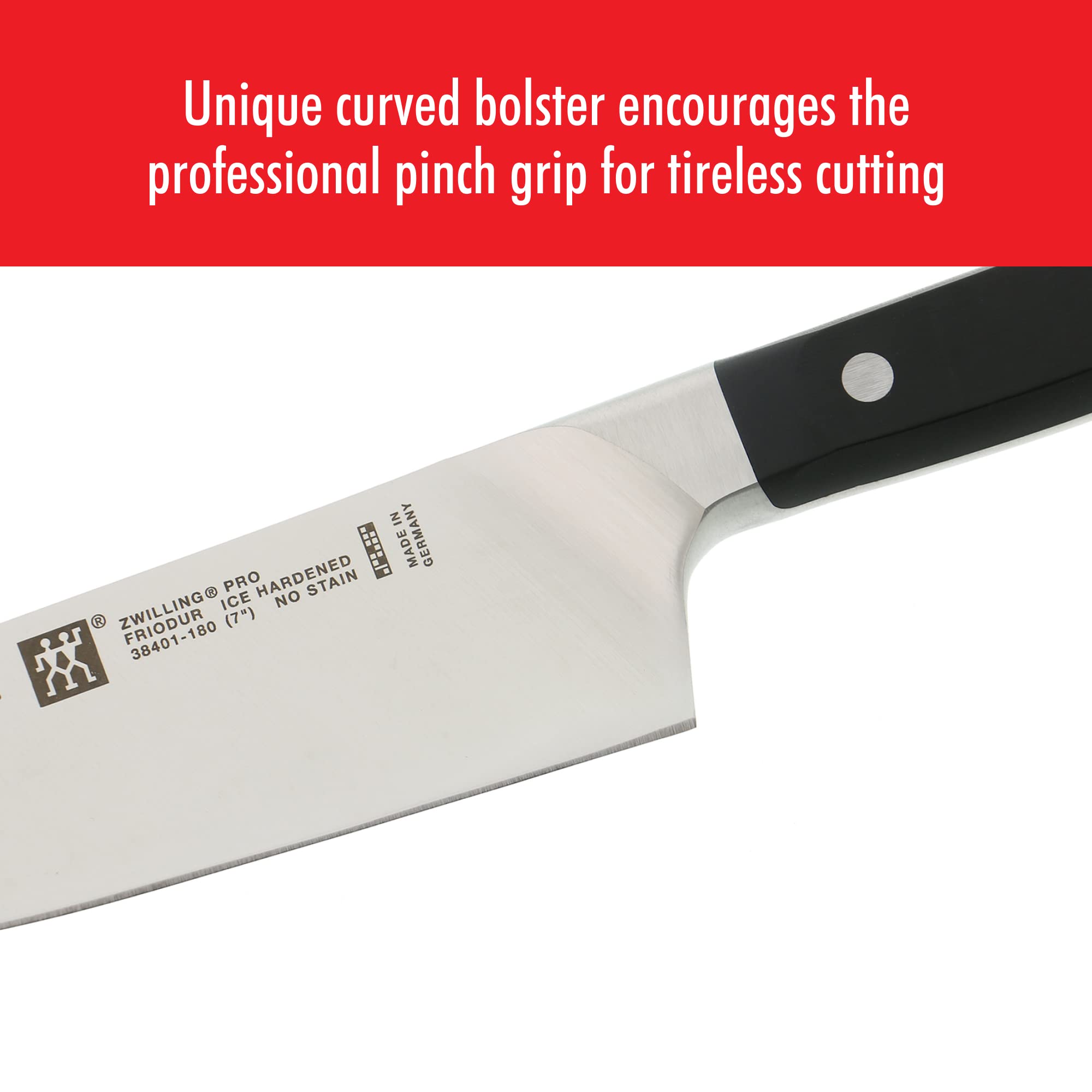 - A unique curved bolster supports the professional pinch grip, with thumb and index finger on the blade, for safe cutting and less fatigue