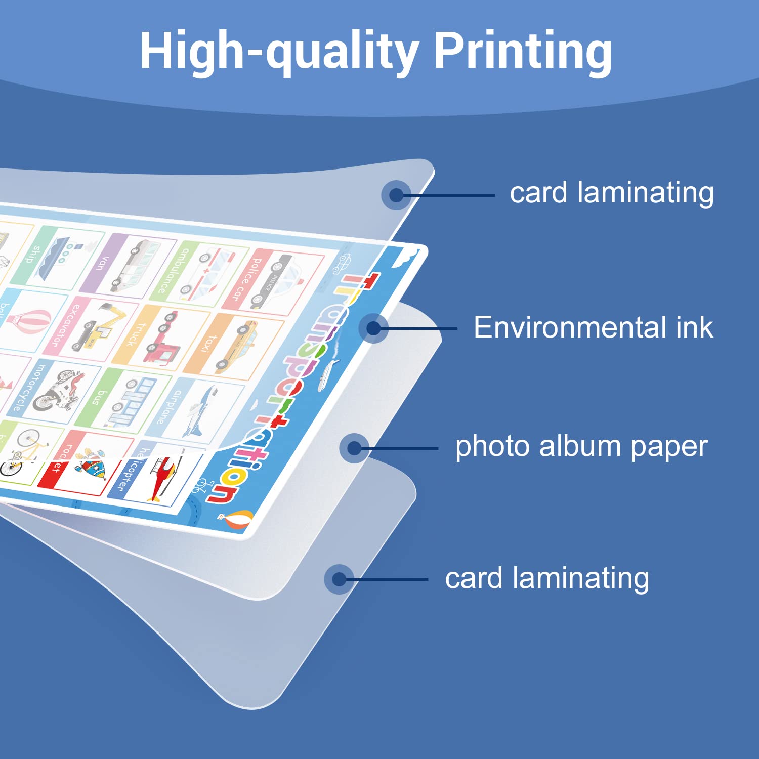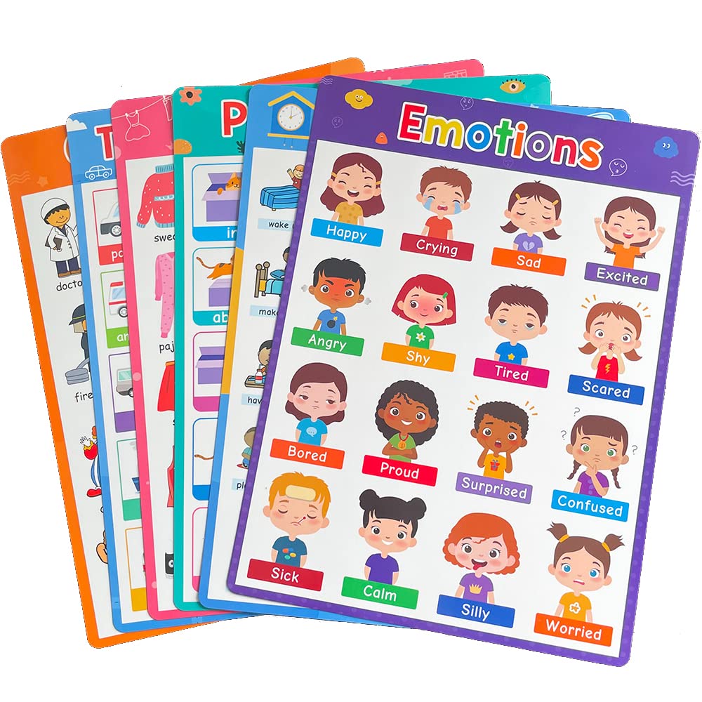 1. Include 6 themes learning posters: Clothes, Occupations, Transportation, Emotions, Daily Routines.2. Perfect handheld A4 size. Colorful and cartoon pictures make learning lively and interesting.3. Paper covered by plastic film, waterproof and durable, you can also write with an oil-based pen for easy erasing.