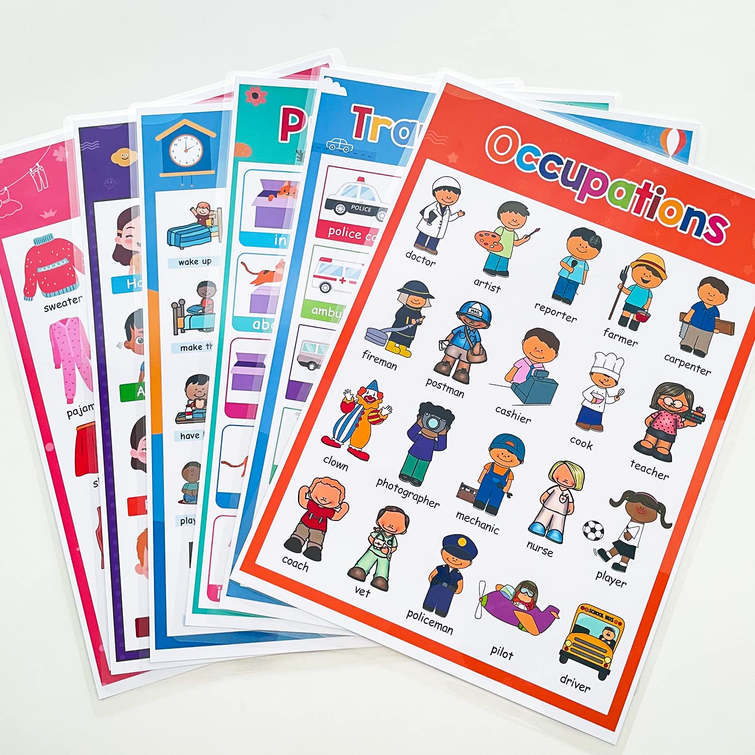 Zwttey 6 Pcs Educational Poster Clothes/Occupations/Transportation/Emotions/Daily Routines, Teaching Aids Classroom Decoration Learning Flashcards Kindergarten Supplies A4 8.26 X 11.22 Inch